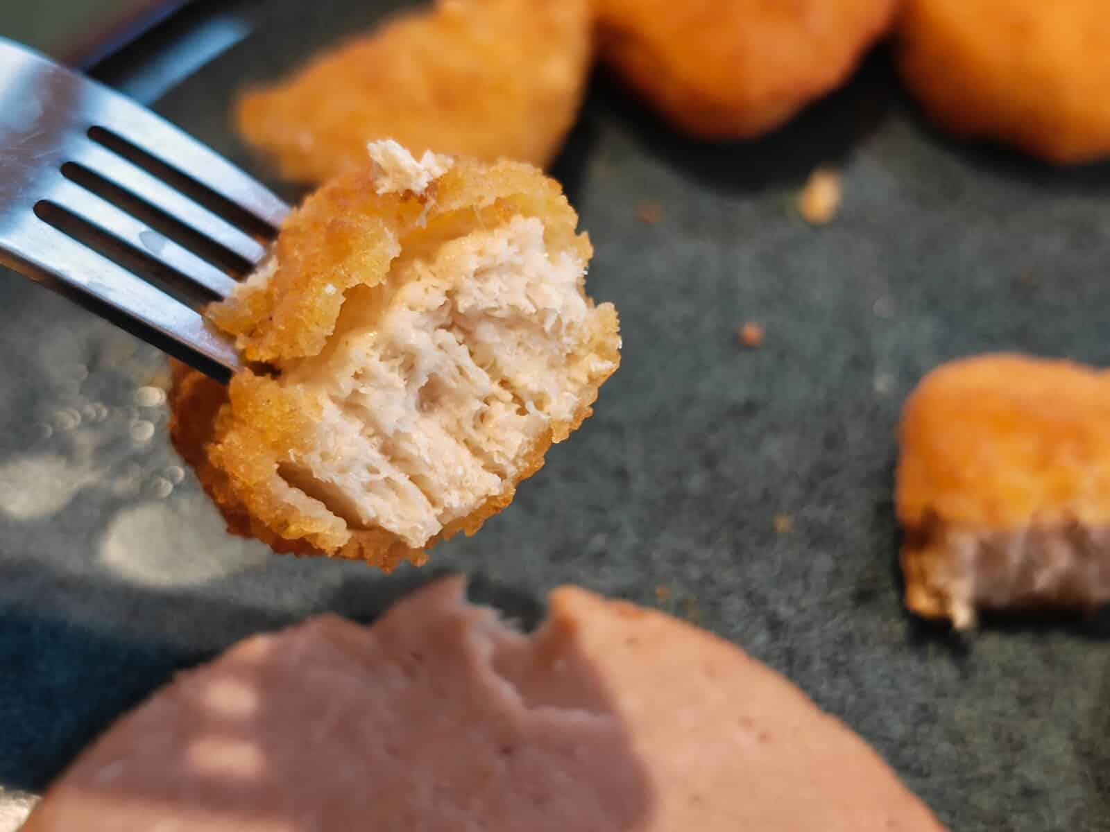 En bouche, la surprise est rapide. La panure est bien dorée. Ensuite, la texture intérieure est moelleuse. Certes, on sent que ce n’est pas du poulet. Pourtant, le plaisir est bien là. D’ailleurs, c’est assez difficile de faire la différence au premier croc.