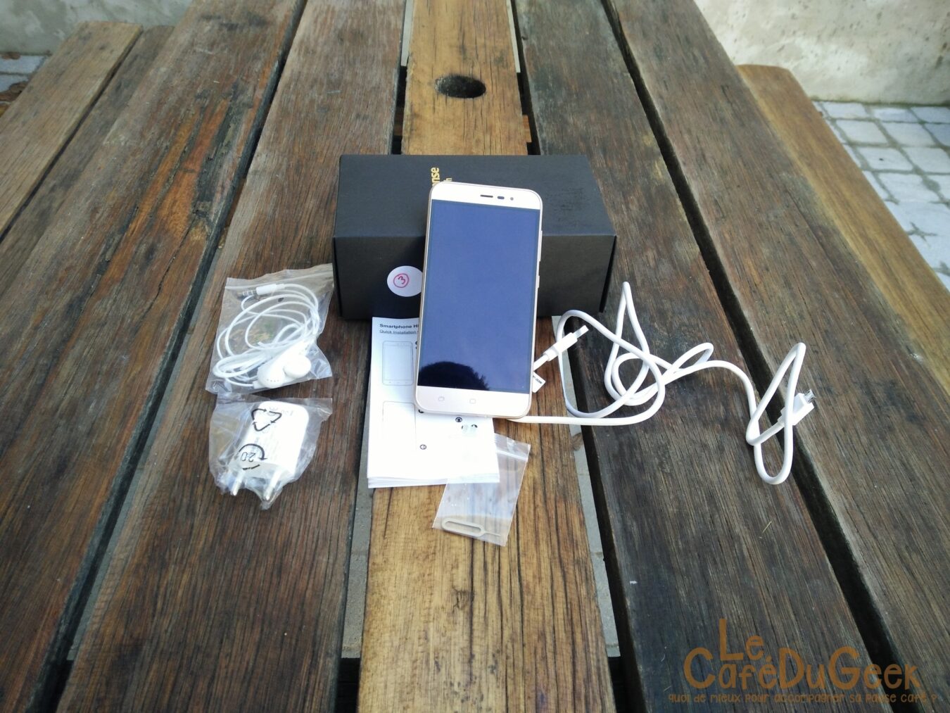 Dès l’ouverture, on retrouve un packaging plutôt complet. Le kit mains libres est bien présent (certaines marques n’en proposent plus de nos jours), le seul regret est au niveau de la qualité. En effet ce ne sont pas des intras et leur confort est relatif. Le chargeur est scindé en 2 parties, le chargeur secteur et le câble USB. À savoir que le chargeur délivre jusqu’à 1A en sortie. Il est également présent l’outil pour ouvrir la trappe SIM ainsi qu’une protection d’écran !
