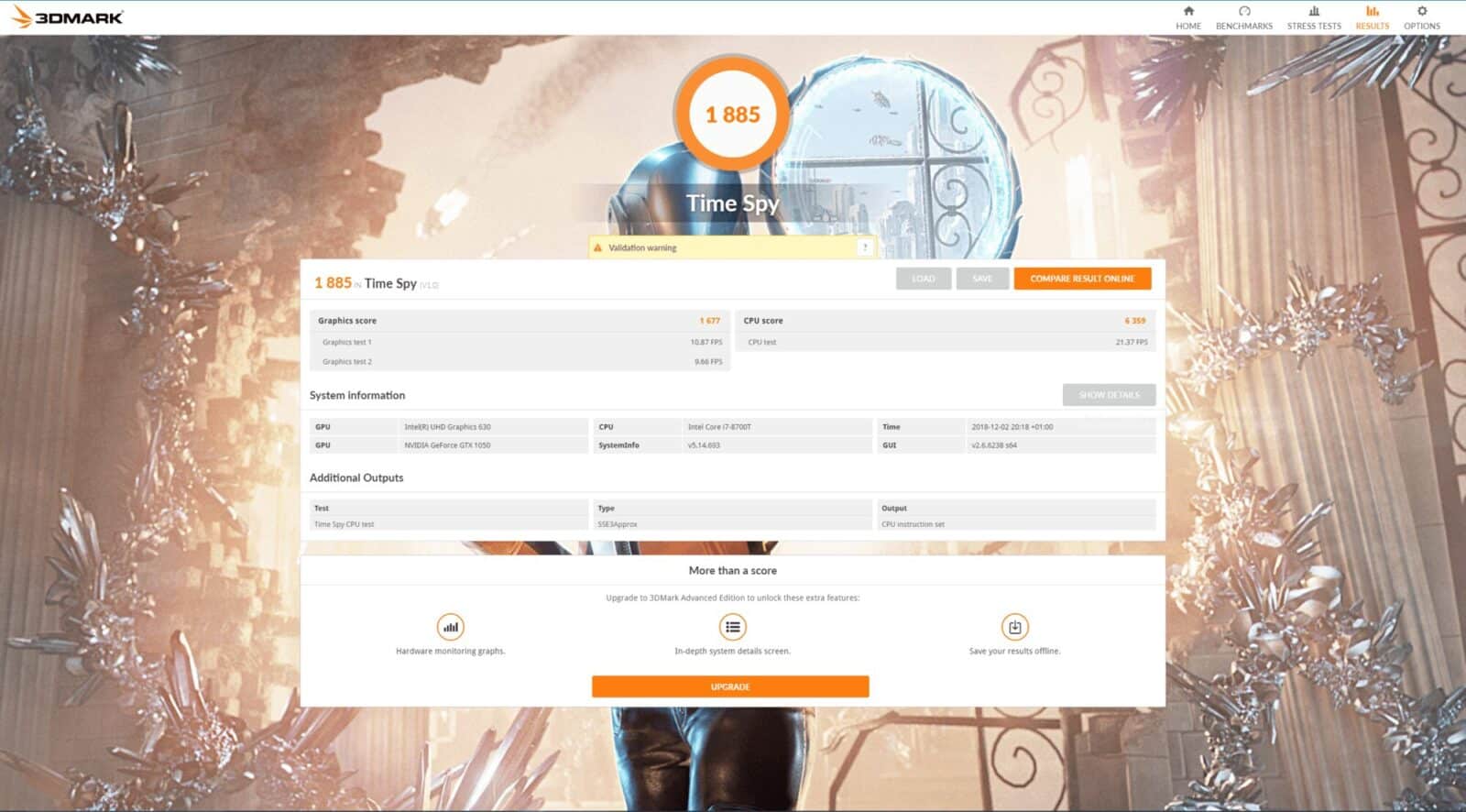 Le HP Pavilion est équipé de très bons composants. On retrouve par exemple: un processeur Intel Core i7 8700T (4 Ghz), une GTX 1050 (4 Go), 16 Go de RAM, un SSD NVMe de 500 Go et un disque dur de 1 To. Avec de telles caractéristiques, les performances globales sont très bonnes. Lors des activités multimédias, même intenses, l’ordinateur effectue les tâches sans ralentissement notable. Celui-ci est extrêmement fluide et permet une forte activité multitâche. On remarque cependant que l’ordinateur chauffe assez fort du côté gauche, ce qui reste compréhensible du fait des composants embarqués et de la place qui leur est allouée. On retrouve par conséquent un score de 1885 sur 3D Mark (Test CPU et GPU).