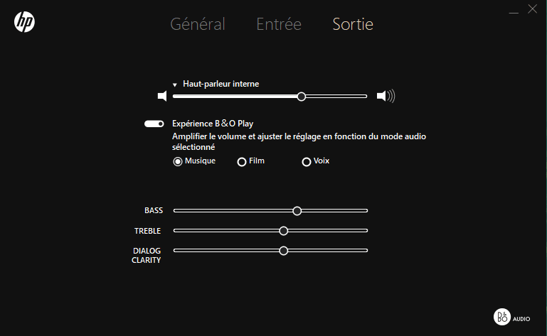 L’ordinateur est fourni avec le logiciel « B&O Play Audio Control » permettant de définir des paramètres personnalisés. Différents presets sont présent permettant de définir une ambiance sonore en fonction de si l’on écoute un film, une musique ou des voix. Avec ce logiciel on remarque une amélioration du son par rapport à la base. En global le son est donc bon, mais pas à la hauteur d’un ordinateur proposé à 1700€.