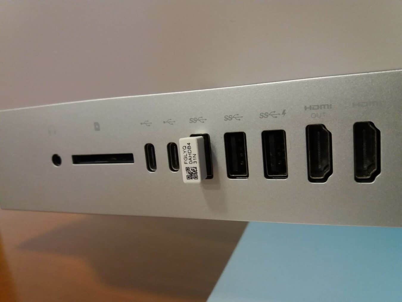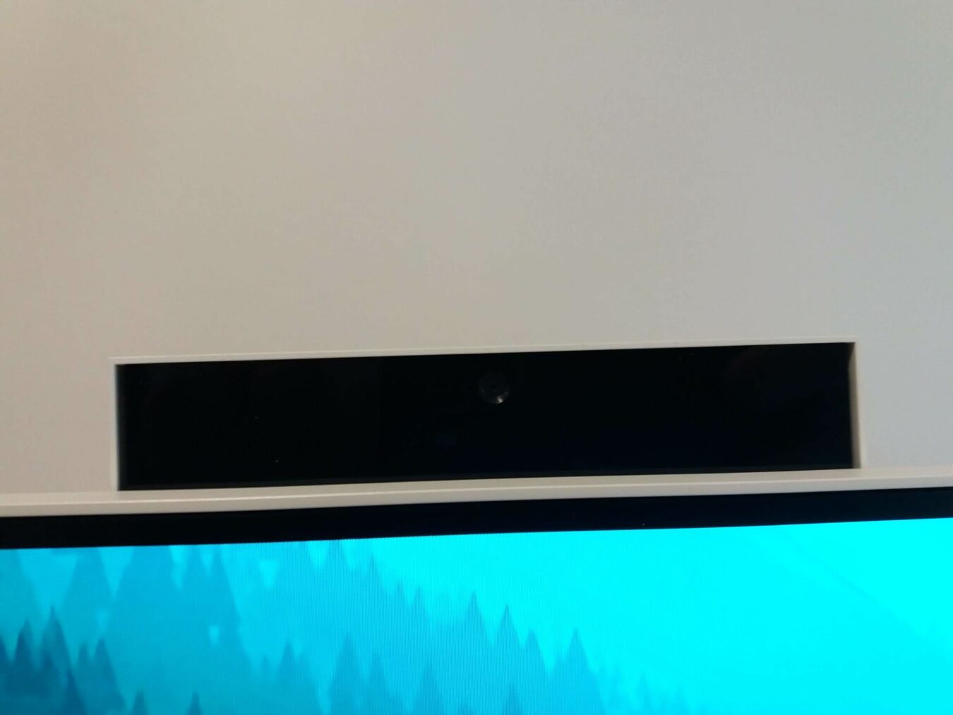 Le bloc contenant les composants est situé sur l’arrière de l’ordinateur. Celui-ci est constitué de la même matière plastique que celle qui entoure l’écran et prend une place minime par rapport aux composants embarqués dans cette machine. Sur le dessus sont disposées les grilles d’aération servant au refroidissement du système. Côté connectique on retrouve une prise casque, 2 ports USB-C, 3 ports USB-A,1 prise casque,un port Ethernet et 2 ports HDMI (1 servant pour partager son écran et l’autre pour se servir de l’écran de l’ordinateur à partir d’une autre source). Sur l’arrière également, nous retrouvons une caméra coulissante permettant lorsqu’elle n’est pas utilisée de la placer derrière l’écran afin de ne pas la voir. Une technologie assez intéressante et prenant compte de la place de l’écran, cependant celle-ci n’est pas automatique.
