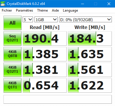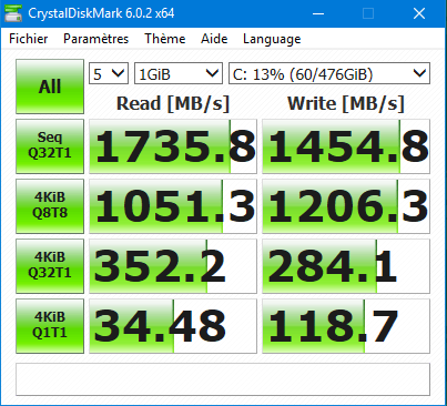 Du côté des performances disque c’est également du très bon. Le SSD NVMe nous propose de très bonnes performances en lecture et écriture, un démarrage très rapide et une utilisation multimédia fluide, il est principalement destiné pour l’installation de logiciel et du système d’exploitation. Le disque dur possède une vitesse de rotation de 7200 tr/mn permettant une utilisation confortable de celui-ci. On retrouve, par conséquent, de bons résultats dans les benchmarks.