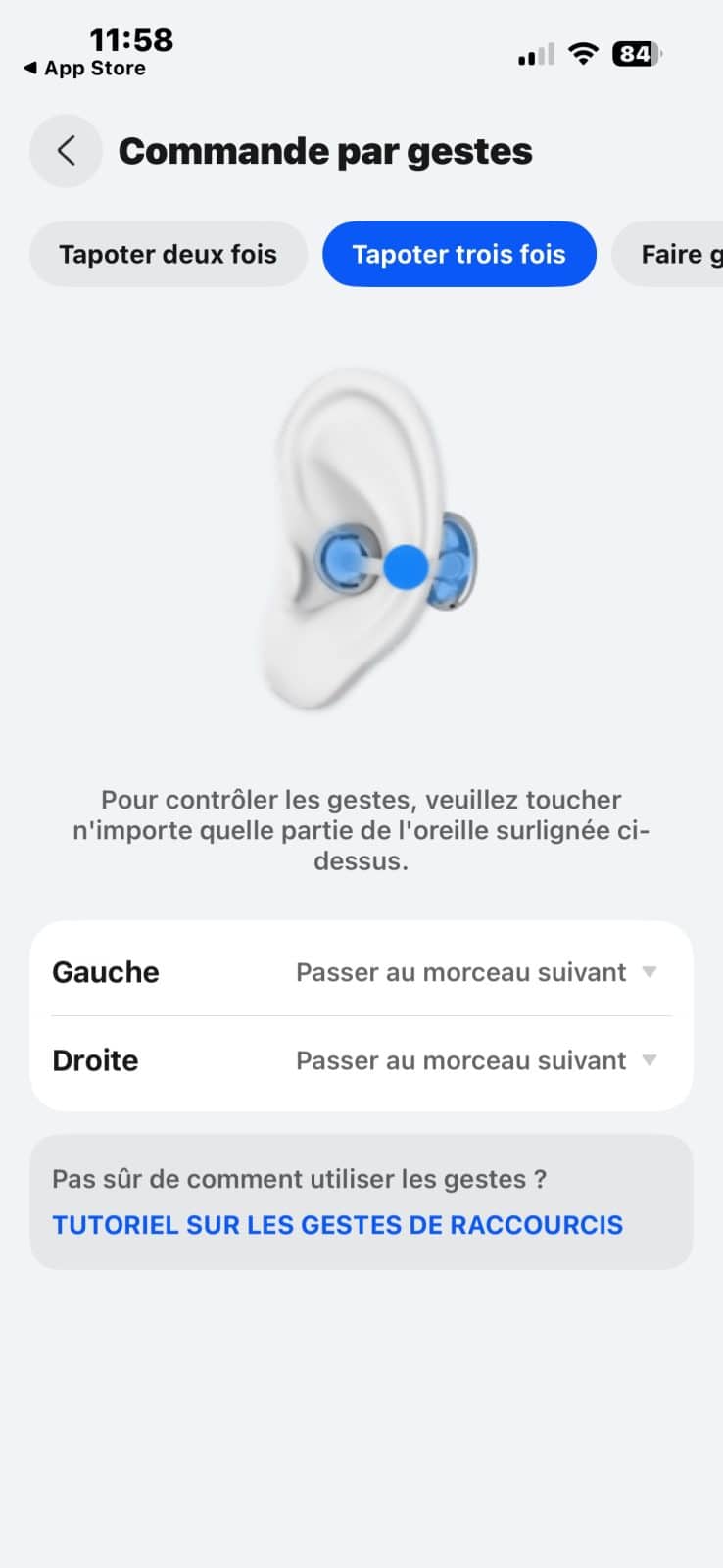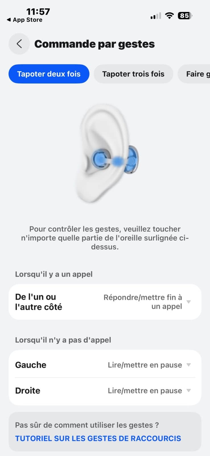 L’application donne accès à plusieurs profils d’égalisation prédéfinis, pensés pour différents usages, ainsi qu’à des réglages personnalisés. Le rendu sonore peut ainsi être ajusté selon les préférences de l’utilisateur. La personnalisation des commandes par gestes constitue l’un des points forts : double ou triple tap, glissement pour le volume et appui prolongé peuvent être configurés séparément pour la musique et les appels.