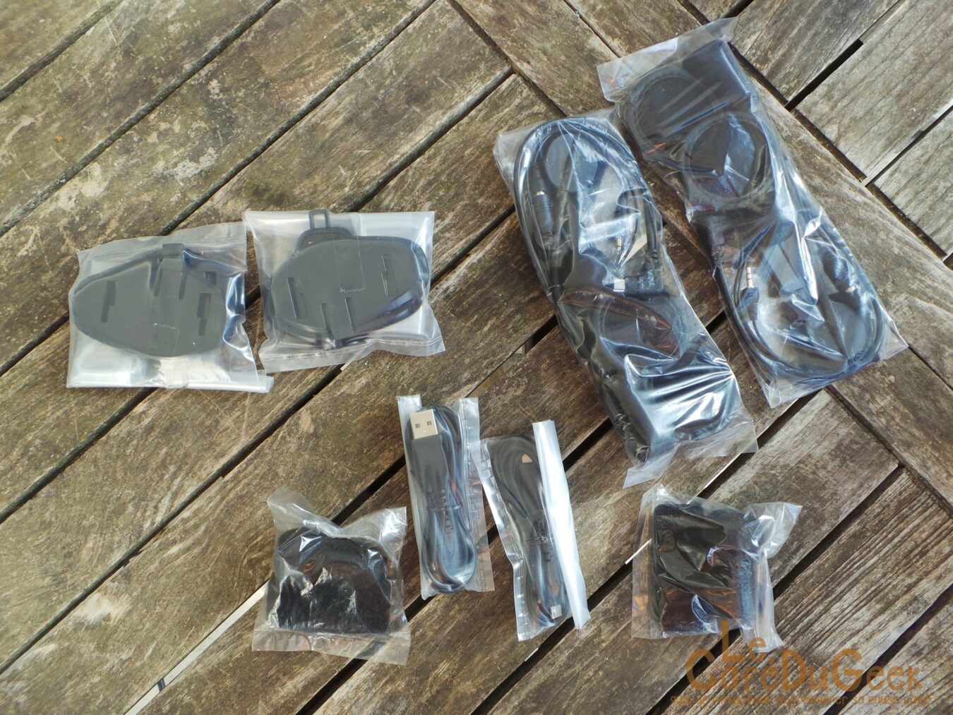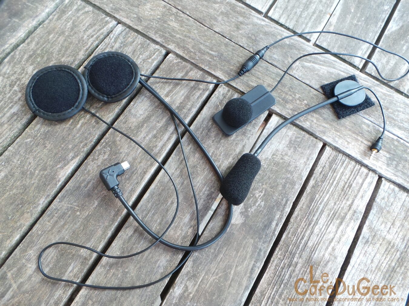 Dès l’ouverture de la boite se présentent les 2 boîtiers intercom. Dessous se logent tous les accessoires qu’il va falloir connecter au boitier ainsi que ceux qui iront dans le casque. Deux types de micros différents (soit un total de 4 micros) sont présents. Un pour les casques de type « jet » et un pour les casques intégraux, qui viendra se coller à l’intérieur de la face avant. Les écouteurs, à venir placer dans les mousses du casque, utilise une fixation avec des adhésifs 3M.