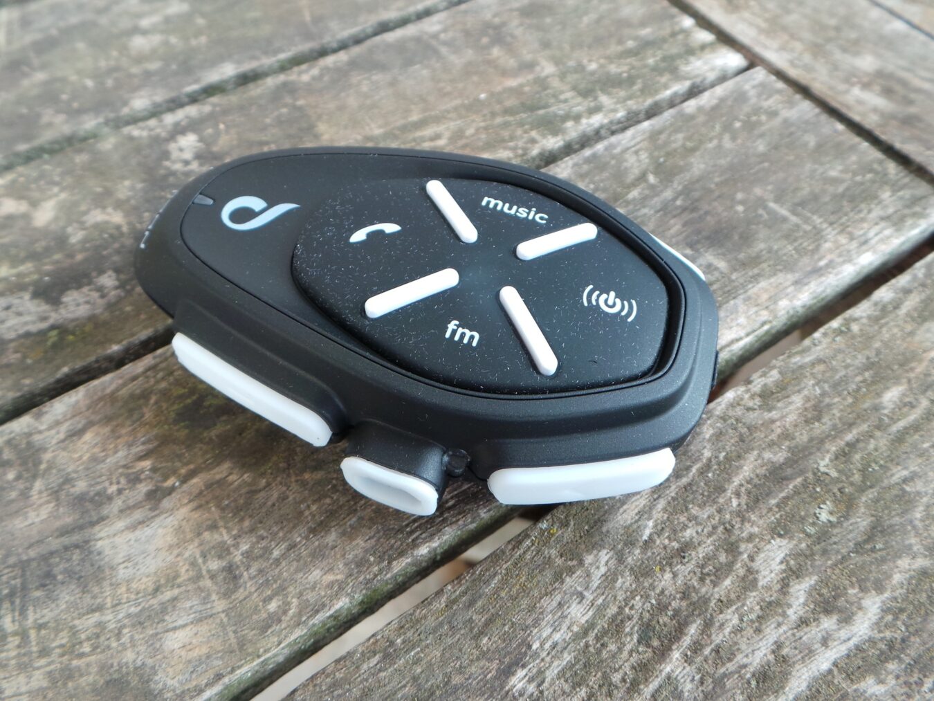 Sur l’intercom est présente toute la connectique nécessaire. Le micro se branche en mini USB, tandis que l’intercom se rebranche en µUSB. 4 boutons sont présents. En appuyant sur celui de gauche, il est possible de lancer des commandes vocales et également de répondre si on vous appelle. Le bouton du haut se comporte en « play/pause » pour la musique. Le bouton à droite est celui de l’alimentation, il fonctionne avec un appui long. Le dernier, en bas, permet de gérer la radio FM.
