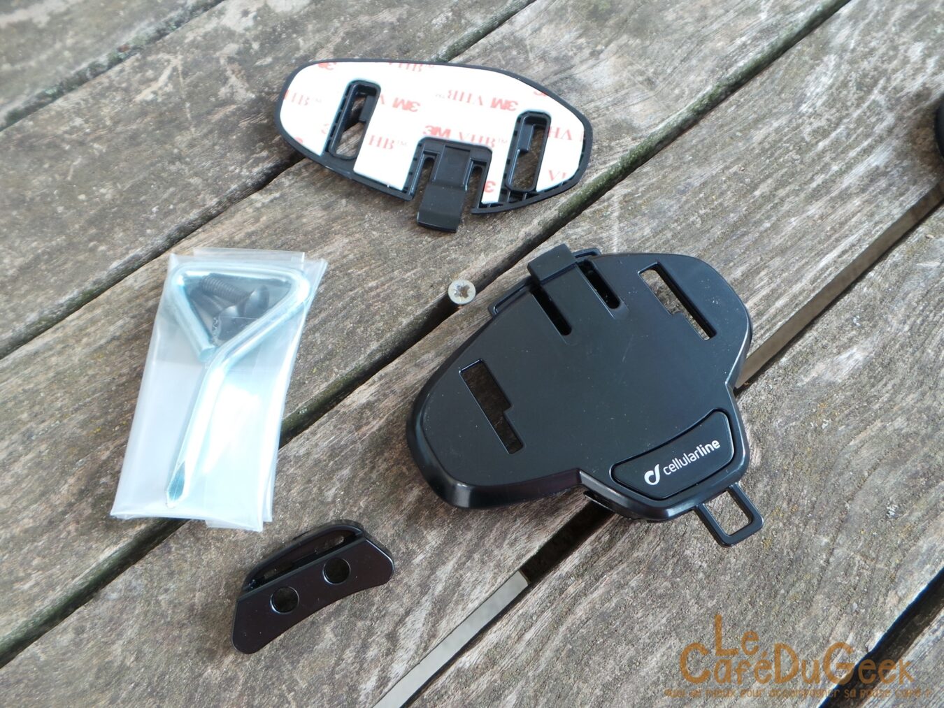 Deux types de fixations sont également présents. Le premier, avec un adhésif 3M, est compatible avec la plupart des casques. Pour les autres, une fixation à vis est disponible.