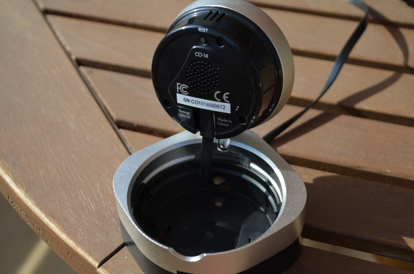 A l’arrière de la caméra Oco, on s’aperçoit qu’elle est équipée d’un microphone et d’un haut-parleur. Ils serviront principalement à entendre les bruits d’une pièce pour vous alerter du danger et de pouvoir y répondre grâce à l’application. Vous pouvez aussi bien vous en servir pour faire fuir des voleurs ou pour calmer votre bébé ! L’installation est très rapide, il suffit de brancher le câble USB sous la caméra via les passes-câble. Cependant, une fois le câble branché, on regrette de voir que celui-ci vient nous gêner lorsque l’on cherche un angle de vue spécial. Afin d’ajouter la caméra sur son smartphone, il suffit simplement de télécharger l’application iVideon et de passer le code-barres devant la caméra pour l’appairer, magique !