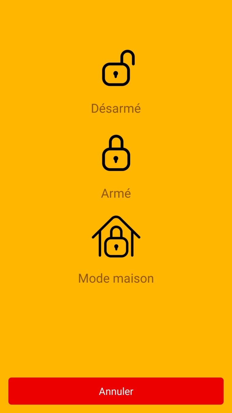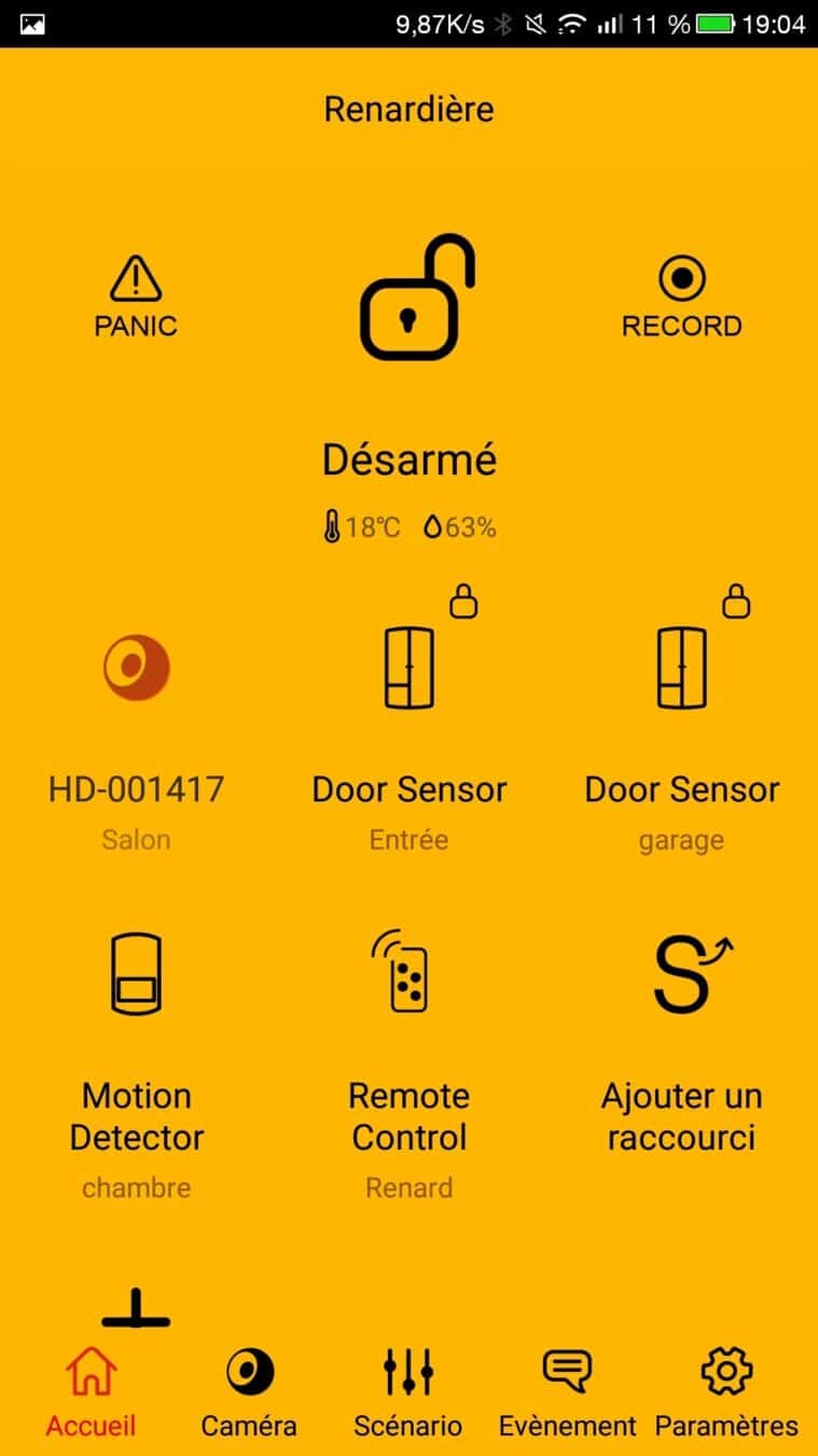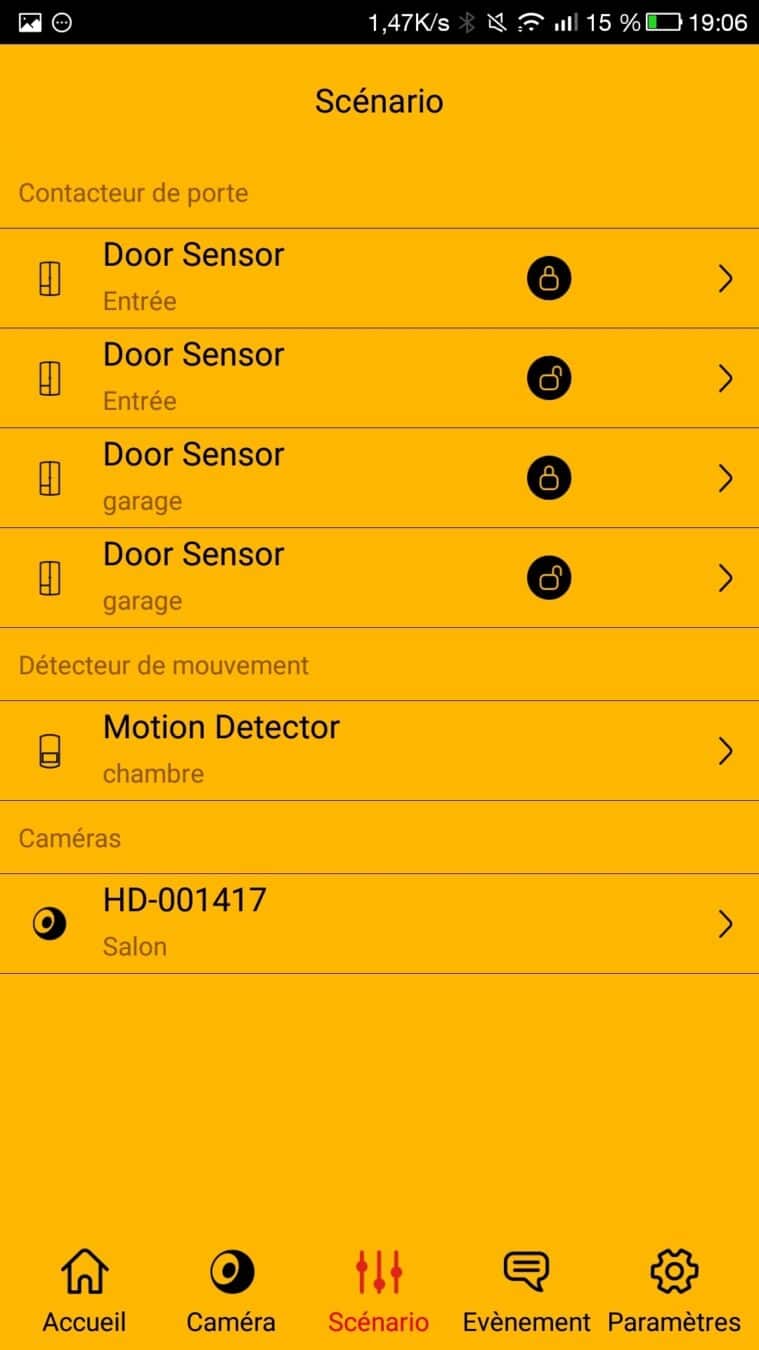 En effet tous les paramétrages, réglages, et autres se passent sur l’application. Elle est vraiment complète et permet de réaliser pas mal de choses. On peut armer ou désarmer l’alarme à distance, créer des scénarios de déclenchements pour chaque capteurs. Changer le volume de l’alarme et bien sûr visionner depuis la caméra.