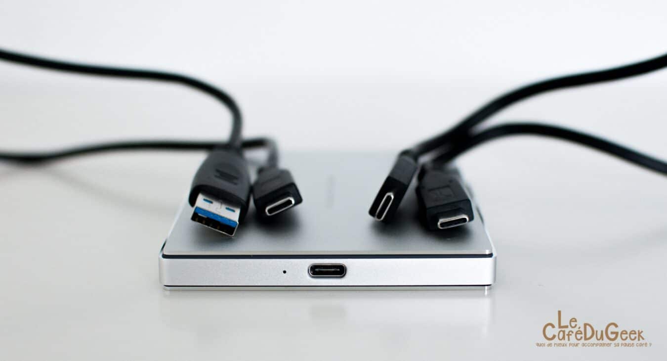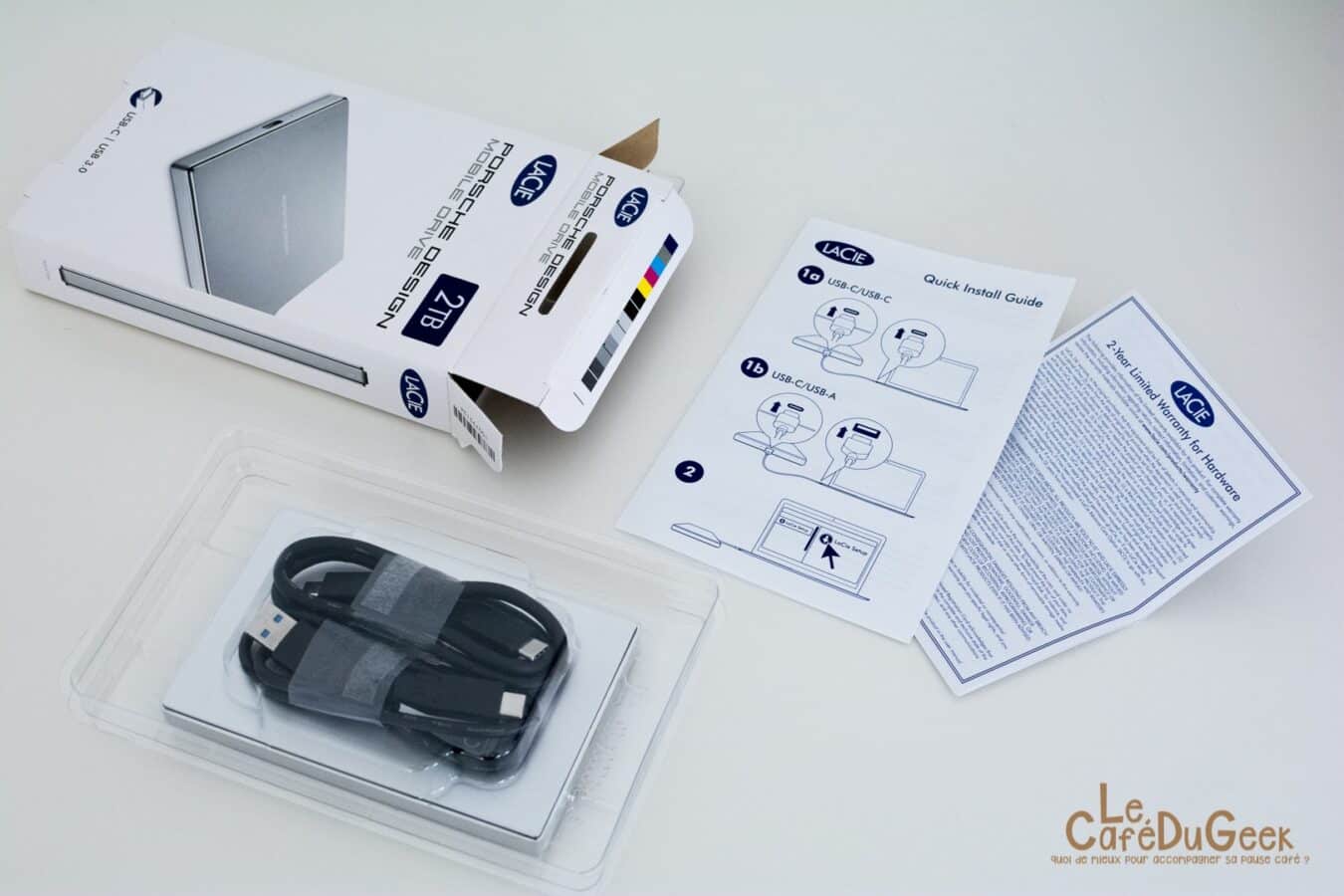 La boite du produit le présente bien. À l’intérieur on y retrouve le disque dur externe LaCie Porsche Design Mobile Drive dans sa version 2 To, soit 2000 Go ; un câble USB-C (type C) ; un câble USB-C vers USB-A (à connecter sur le classique port USB que l’on connait tous) ; une notice et un feuillet pour la garantie de 2 ans.