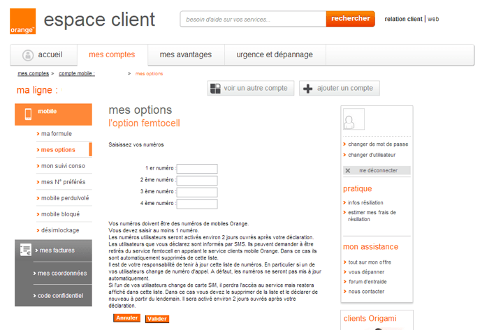 Pour que votre femtocell fonctionne correctement, il faut déclarer vos numéros de portable (Orange ou Sosh) pour éviter l’usage de votre boitier par n’importe qui ! La ligne qui possède l’option n’a pas besoin de cet enregistrement, d’où le seul téléphone qui fonctionne. Pour les autres, direction l’espace client : mes Options > L’option Femtocell > Modifier