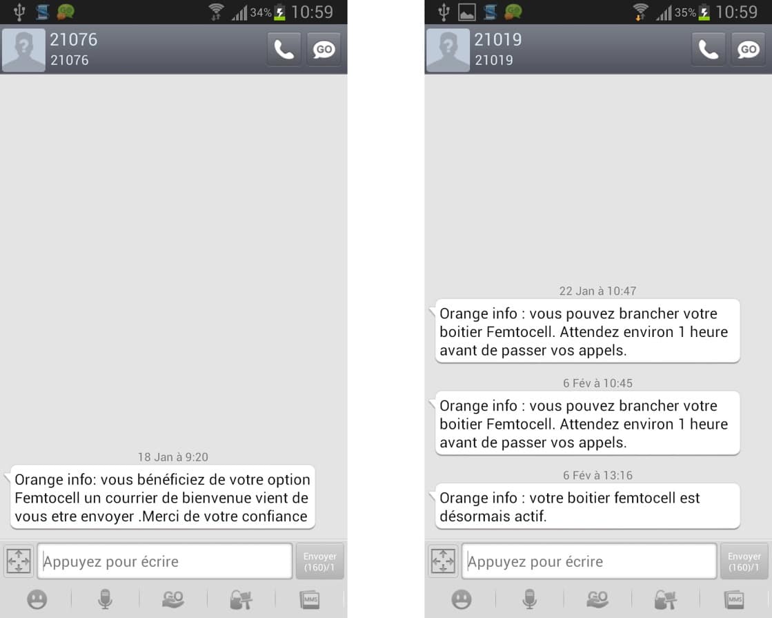 22 Janvier 2013 : Réception d’un SMS m’invitant à brancher le femtocell. Je le laisse tourner toute la nuit mais rien.