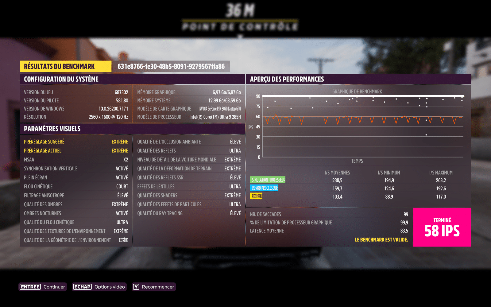 Les performances sur le papier, c’est bien beau, mais que vaut ce Yoga Pro 9i dans la réalité ? Dans un premier temps, nous allons les vérifier en jeu, avec les benchmarks sur Forza Horizon 5 ou encore Cyberpunk 2077. On peut remarquer que sur Forza l’ordinateur s’en sort très bien avec quasiment 60 FPS stable avec les graphismes au maximum. Le point important à noter également, c’est qu’aucun bottleneck n’est a noté et que la configuration (CPU + GPU) est bien dimensionnée.