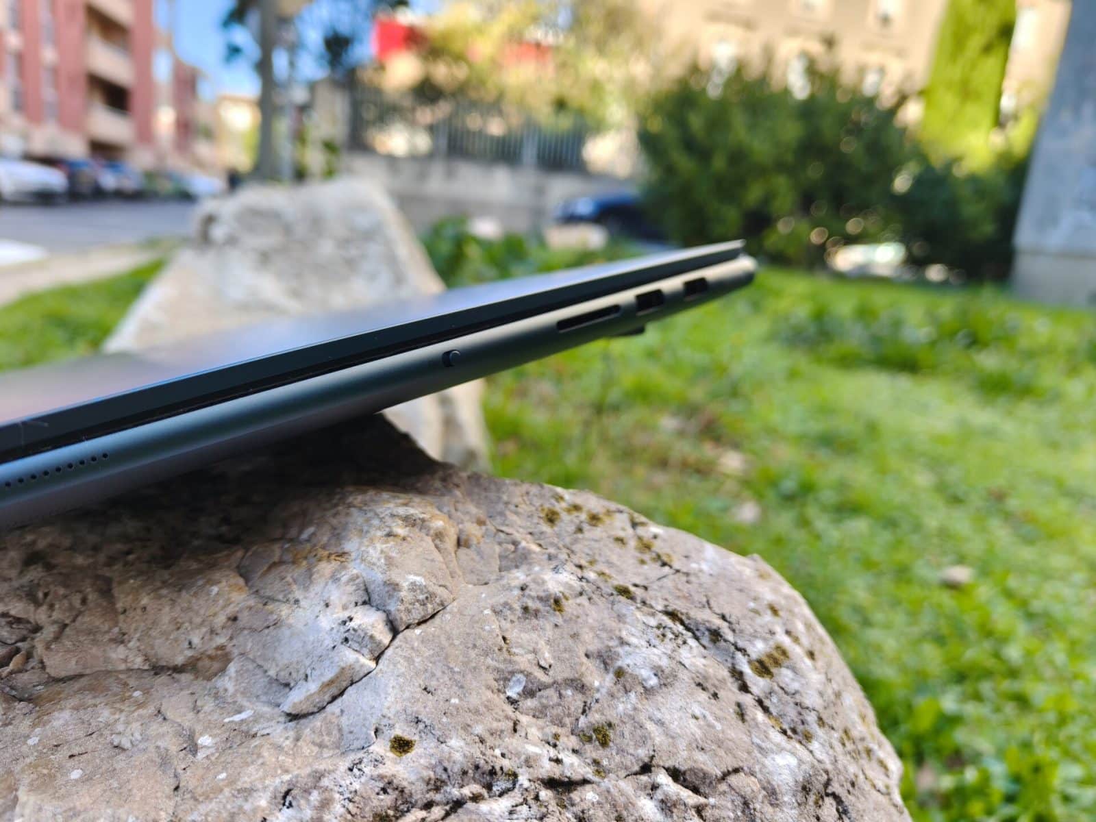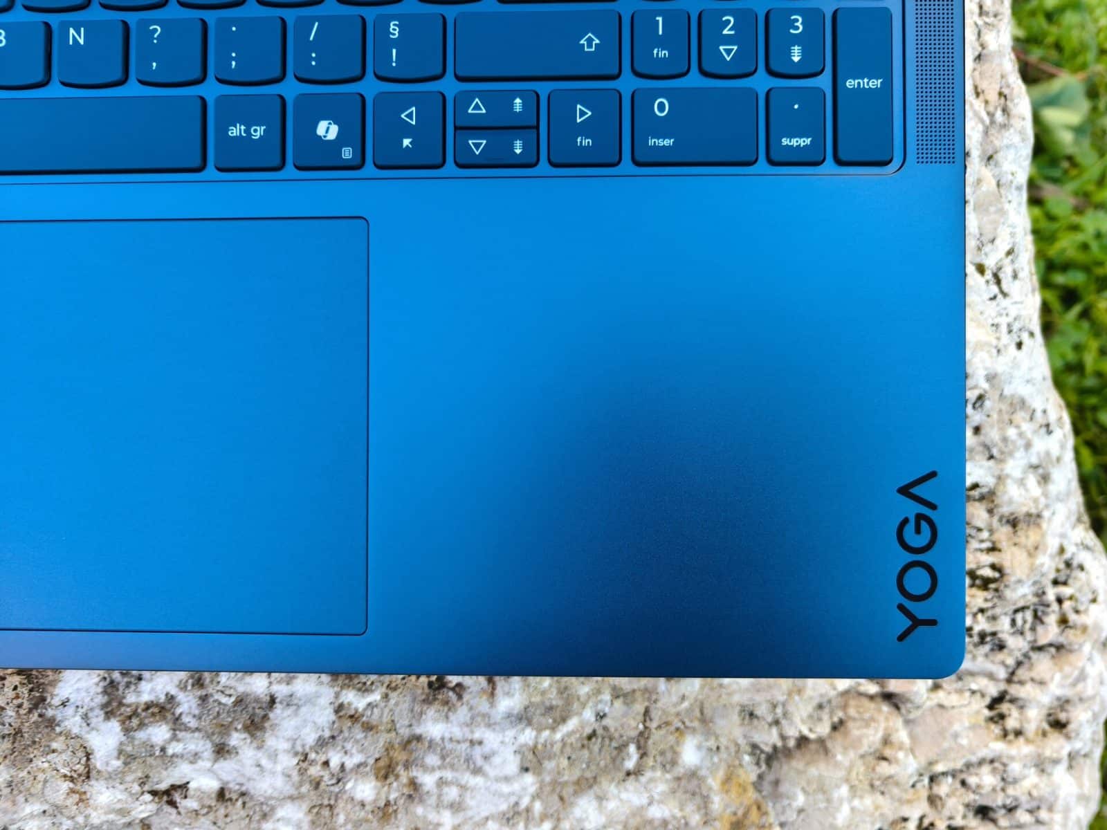 Le Yoga Pro 9i est disponible en deux coloris, Luna Grey ou Tidal Teal. C’est ce dernier que nous avons à la rédaction, et le rendu est très joli. Les finitions sont excellentes, avec un toucher qui respire la qualité, notamment grâce à la présence d’un châssis aluminium du plus bel effet. On retrouve un clavier 100% rétroéclairé avec une course de 1.5 mm offrant un confort de frappe correct. Le trackpad est immense (15 cm x 9,5 cm) et propose un excellent confort d’utilisation avec de multiples gestes disponibles. Avec son écran de 16″, le Yoga Pro 9i est un beau bébé en termes de dimensions, mais qui arrive malgré tout à conserver une épaisse relativement faible, au vu des performances.