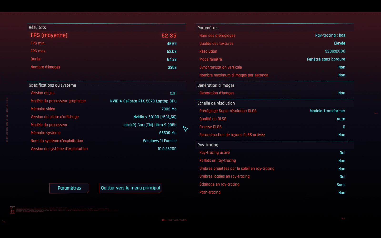 Les performances sur le papier, c’est bien beau, mais que vaut ce Yoga Pro 9i dans la réalité ? Dans un premier temps, nous allons les vérifier en jeu, avec les benchmarks sur Forza Horizon 5 ou encore Cyberpunk 2077. On peut remarquer que sur Forza l’ordinateur s’en sort très bien avec quasiment 60 FPS stable avec les graphismes au maximum. Le point important à noter également, c’est qu’aucun bottleneck n’est a noté et que la configuration (CPU + GPU) est bien dimensionnée.
