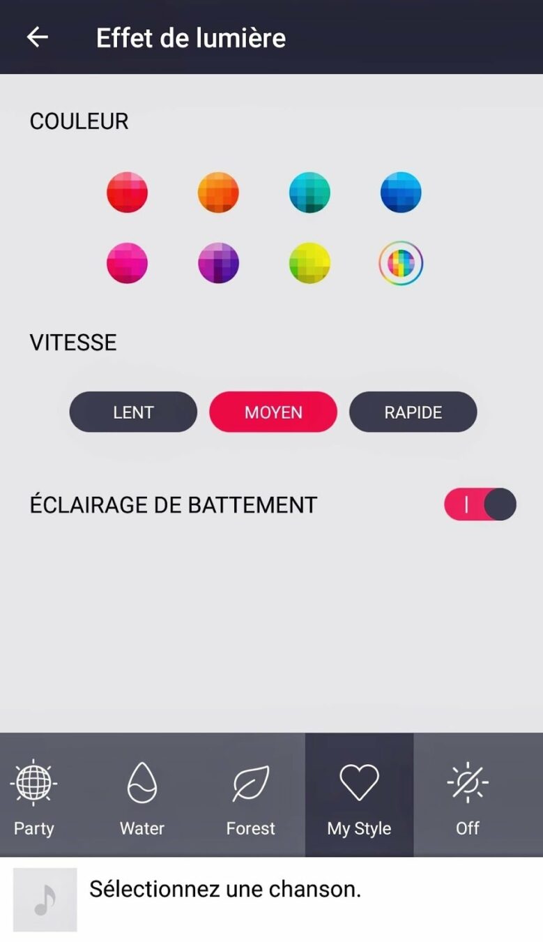 L’application est plutôt intuitive. Ainsi l’interface mobile vous permet de mettre en place le mode Duel Play, les différents modes fournis par Meridian, de gérer totalement les jeux de lumière (éclairage de battement, vitesse, couleurs, style), de créer des playlists. Petit plus, l’application vous indique également le niveau de charge de la batterie.