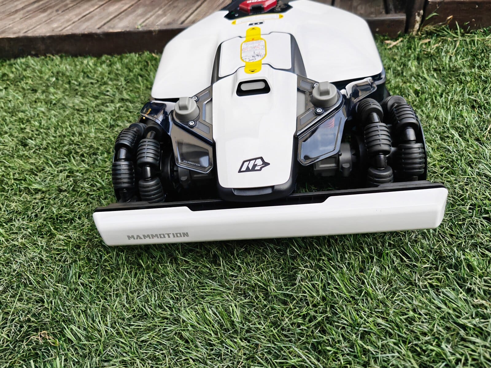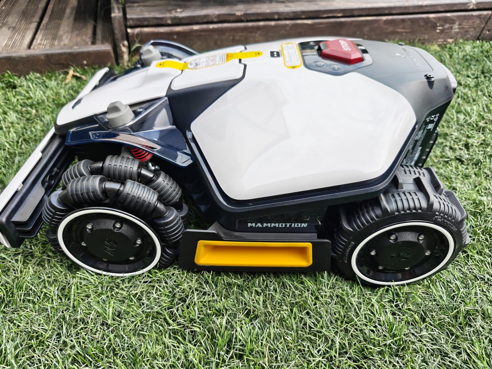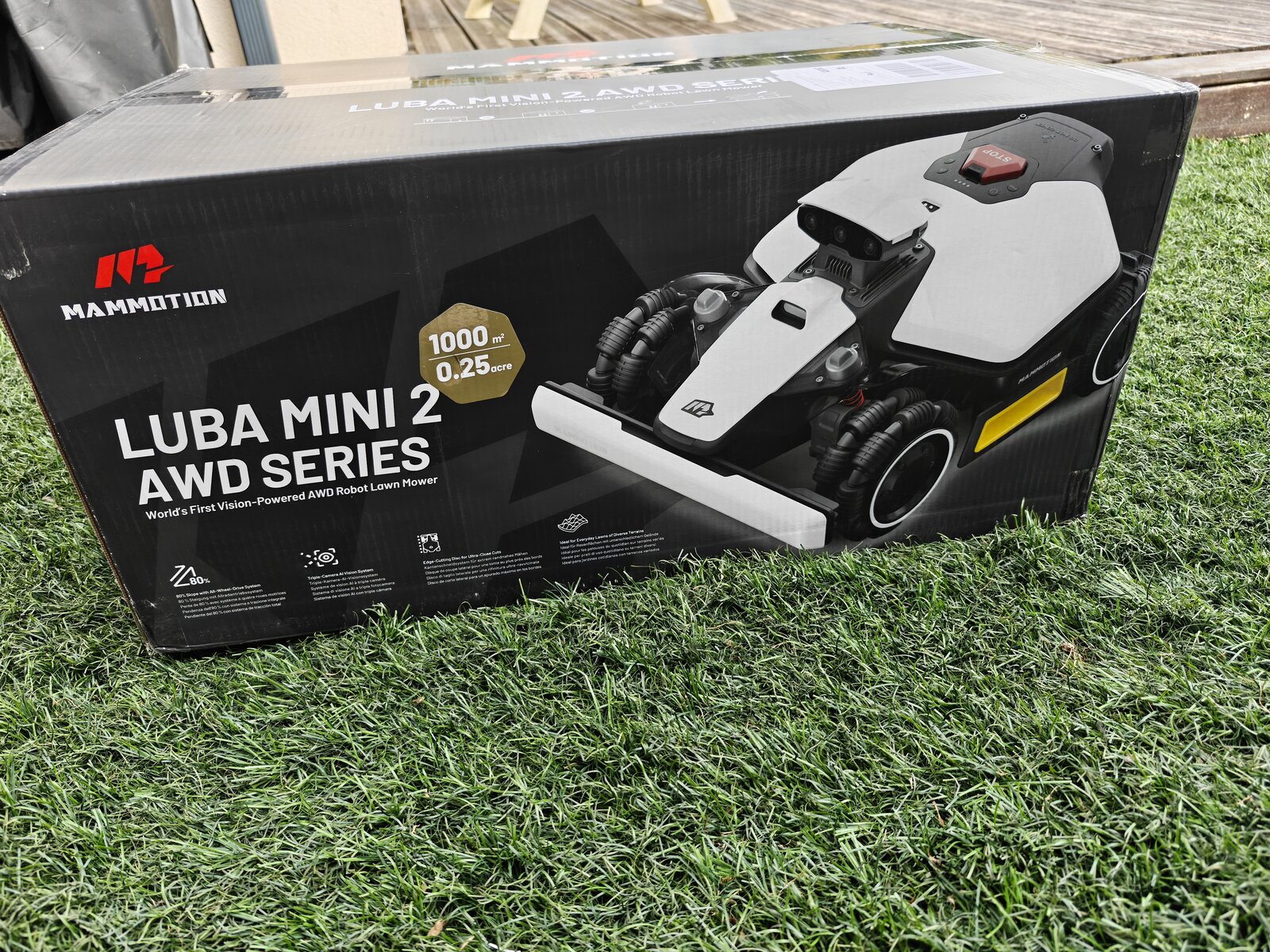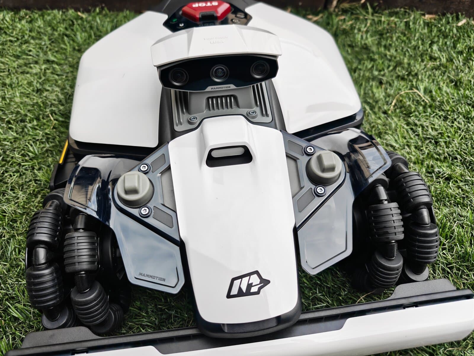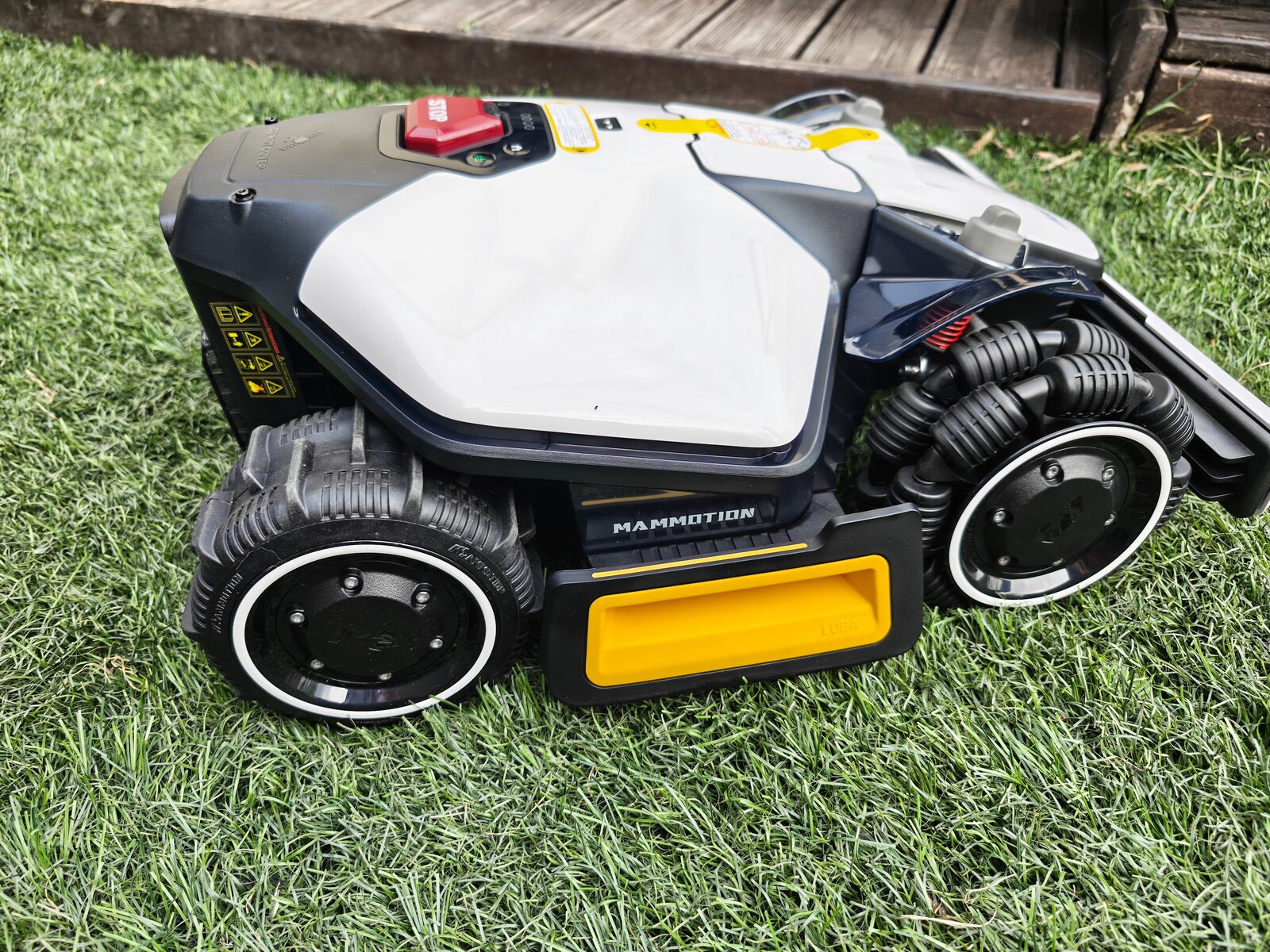 Dès l’ouverture, on reconnait le design typique Mammotion. Seule la tête de détéction change en fonction du modèle, Lidar ou RTK. Contrairement au test du modèle Lidar, ce nouveau LUBA Mini 2 AWD 1000 adopte une approche toujours agressive. Certains y collent même des Stickers de F1 pour la personnaliser. Ensuite, les roues AWD donnent immédiatement confiance, surtout sur terrain en pente.