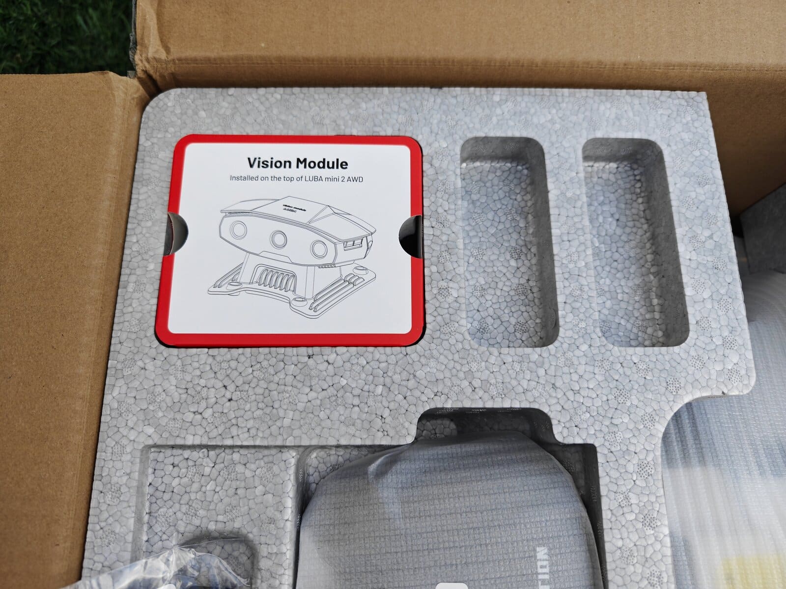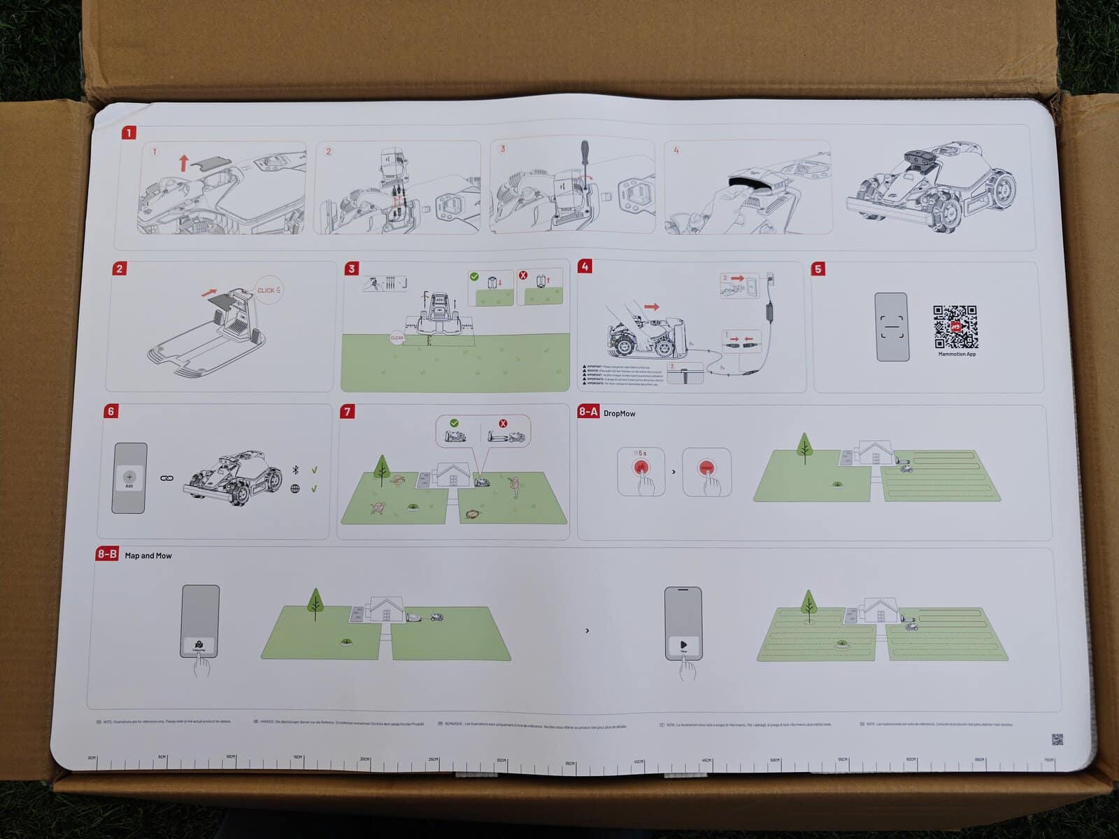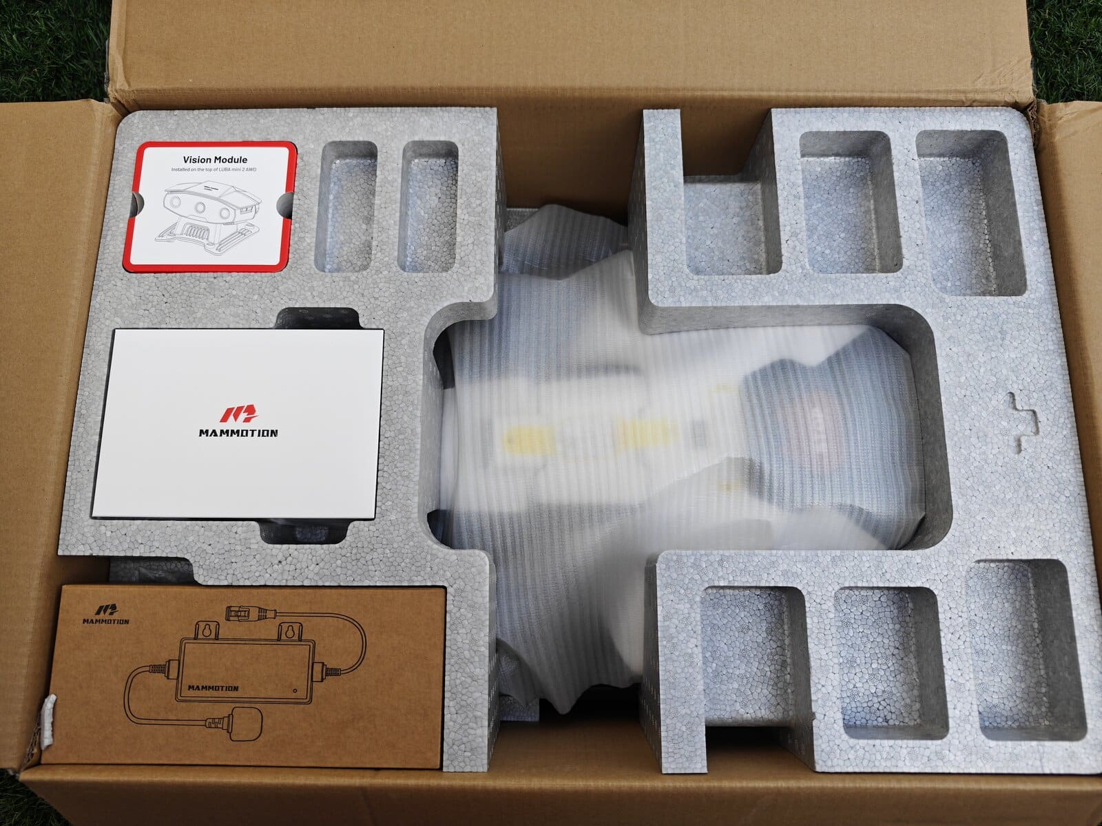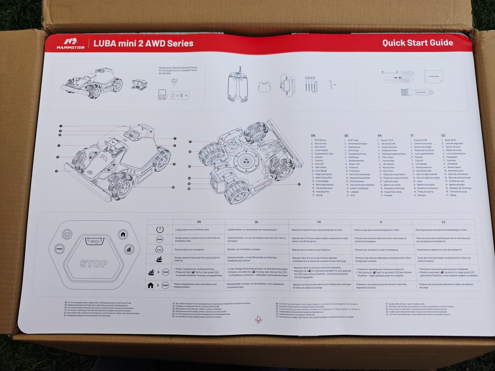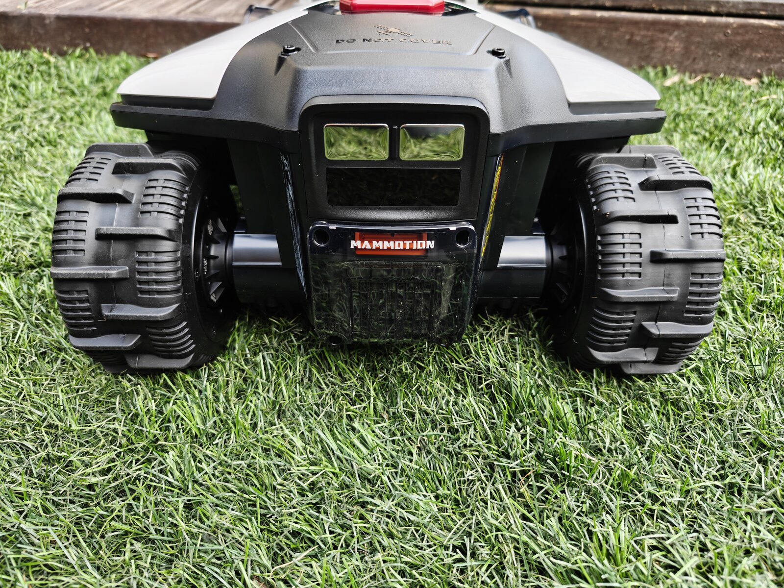 Dès l’ouverture, on reconnait le design typique Mammotion. Seule la tête de détéction change en fonction du modèle, Lidar ou RTK. Contrairement au test du modèle Lidar, ce nouveau LUBA Mini 2 AWD 1000 adopte une approche toujours agressive. Certains y collent même des Stickers de F1 pour la personnaliser. Ensuite, les roues AWD donnent immédiatement confiance, surtout sur terrain en pente.