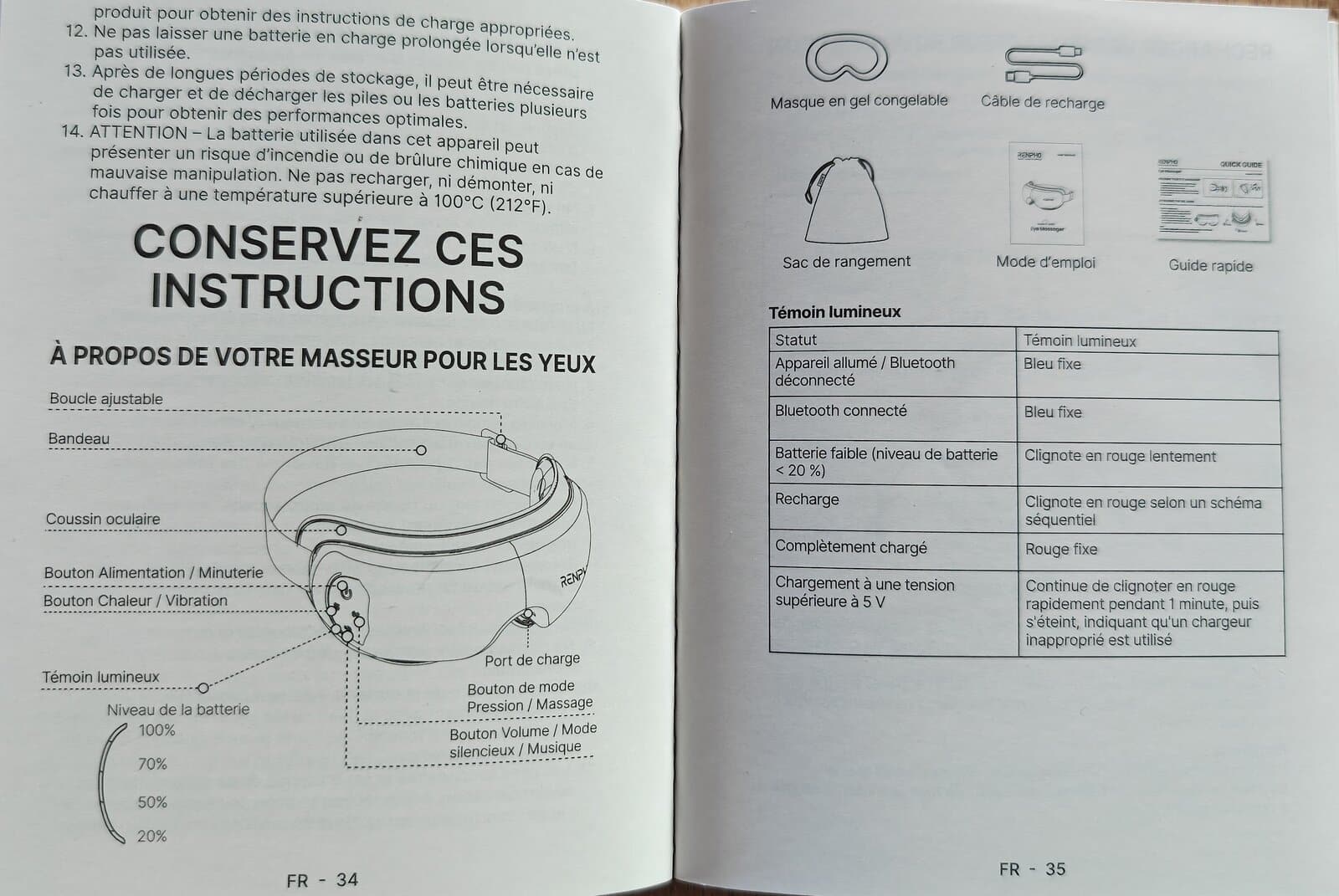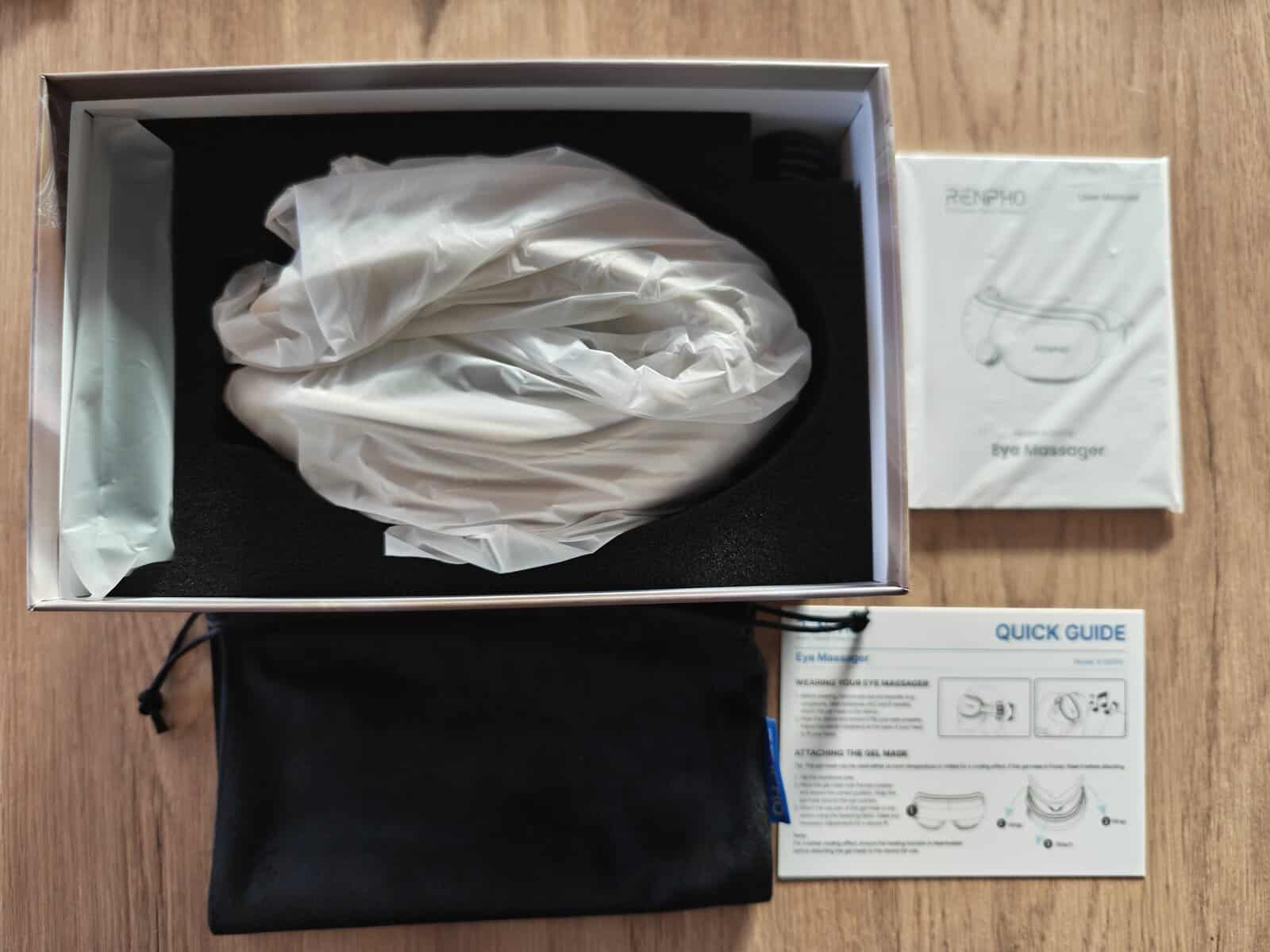 Dès l’ouverture, le RENPHO EYERIS 3 inspire une certaine qualité. Le masque est bien protégé. Les accessoires sont correctement rangés. On retrouve :