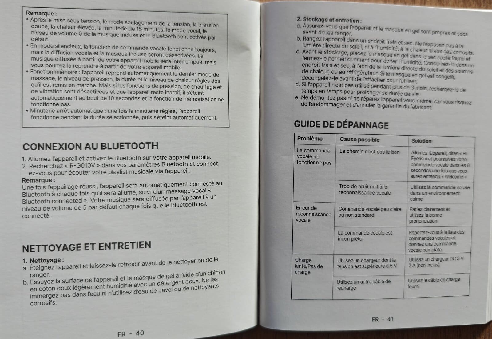 En revanche, le système de massage génère un léger bruit de gonflage. Ce point peut surprendre au départ. Heureusement, les sons d’ambiance intégrés et la connexion Bluetooth compensent efficacement. Un masque pensé pour la détente, pas pour l’usage nomade.