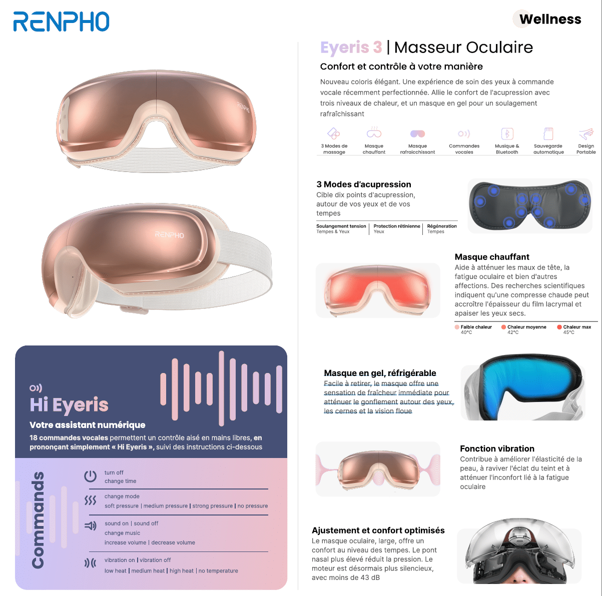 RENPHO, déjà bien installé sur le segment du bien-être connecté, propose avec l’EYERIS 3 une nouvelle version de son masque massant pour les yeux. Promesse annoncée : relaxation profonde, chaleur apaisante et immersion sonore. Après plusieurs sessions d’utilisation, voici un retour complet.
