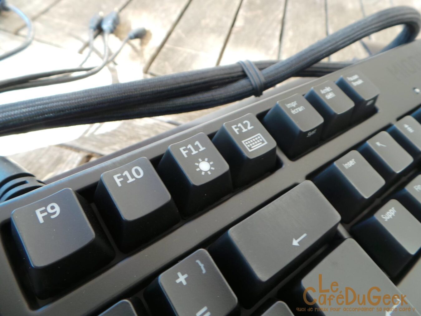 A savoir qu’aucun logiciel n’est fourni. Tout se contrôle via le clavier, que ce soit la luminosité ou les contrôles média. Il n’y a donc pas la possibilité de créer des listes de macros. Le bouton « Mionix », à la place habituelle du bouton Windows, permet d’activer les fonctions spéciales. Il y a 3 modes de luminosité disponible – éteint, ZQSD ou tout le clavier – avec 4 niveaux d’intensité lumineuse le tout paramétrable via les touches F11 et F12.