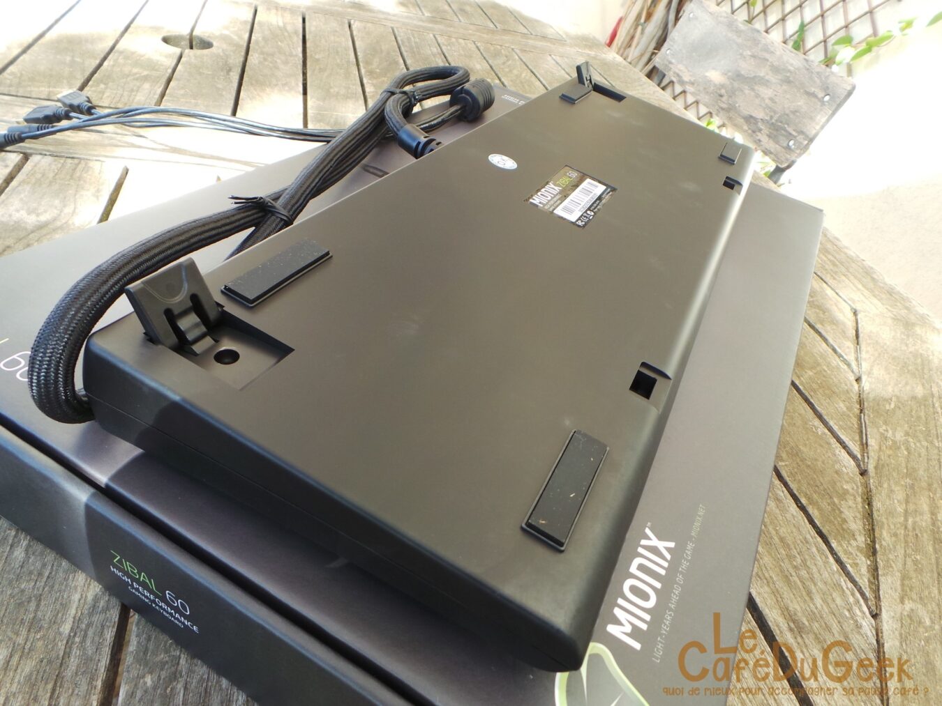 Le Zibal possède sur sa partie inférieure deux pieds afin d’utiliser le clavier dans deux positions différentes. Quatre embouts en caoutchoucs sont également présents pour maintenir le Zibal 60 en place.