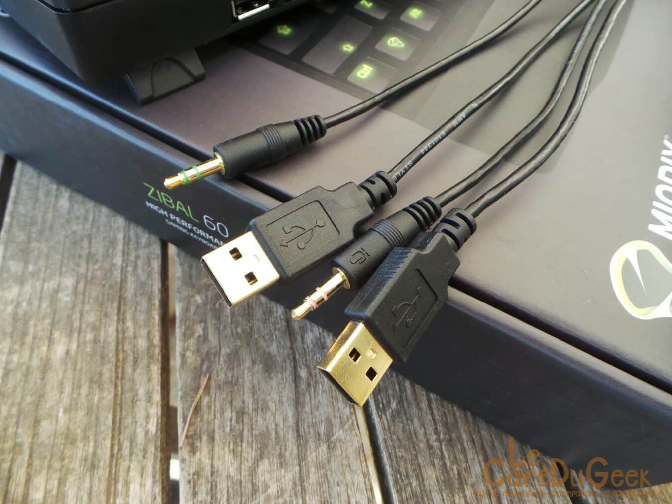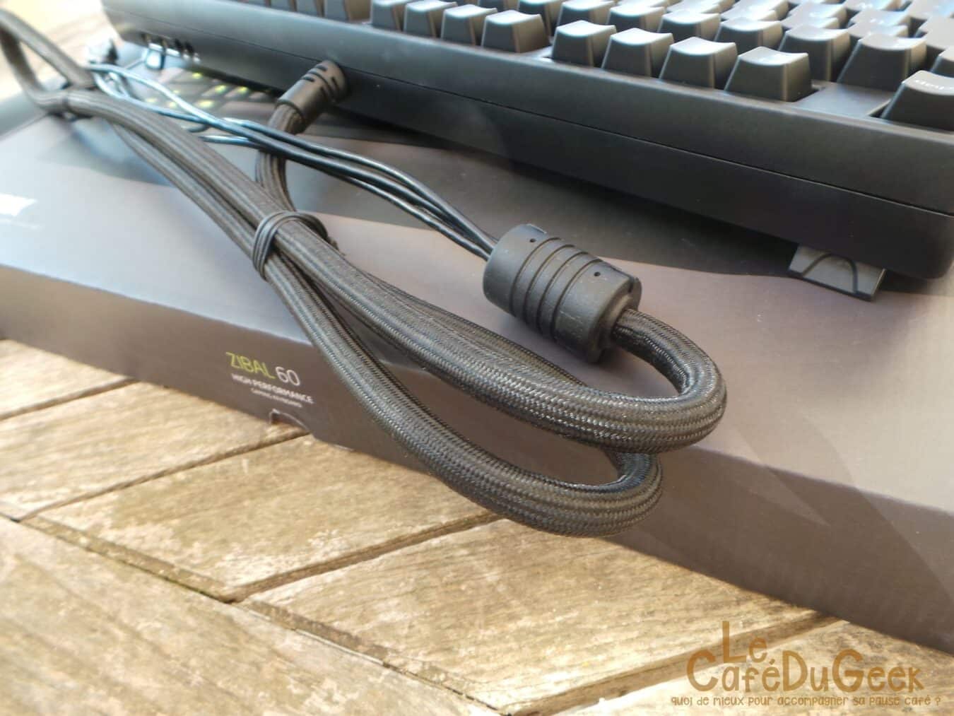 La spécificité de ce clavier se retrouve dans les finitions. En effet le savoir-faire mis en oeuvre par Mionix pour la conception de ce clavier est de très bonne qualité. J’ai rarement eu un clavier de cette facture en main. Il est également certifié « rage-proof » par Mionix, ce qui lui confère une solidité à l’épreuve des accès de rage des joueurs. Une plaque de 1.6mm , conçue en acier, est présente sous les switchs Black Cherry MX pour plus de solidité. De plus, tout est pensé pour un gain de place. Une seule gaine pour les 4 câbles présents : Deux prises USB, une pour alimenter le clavier et la seconde pour alimenter les 2 ports USB présents à l’arrière du clavier, et les habituelles prises jack 3.5mm ainsi que le micro.