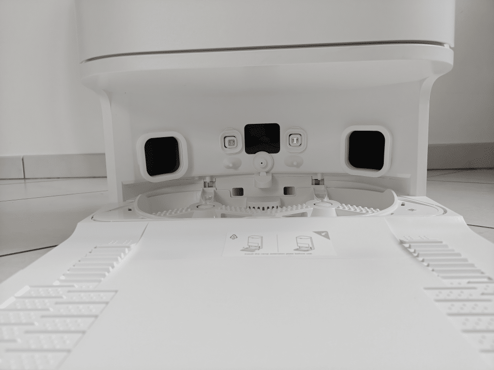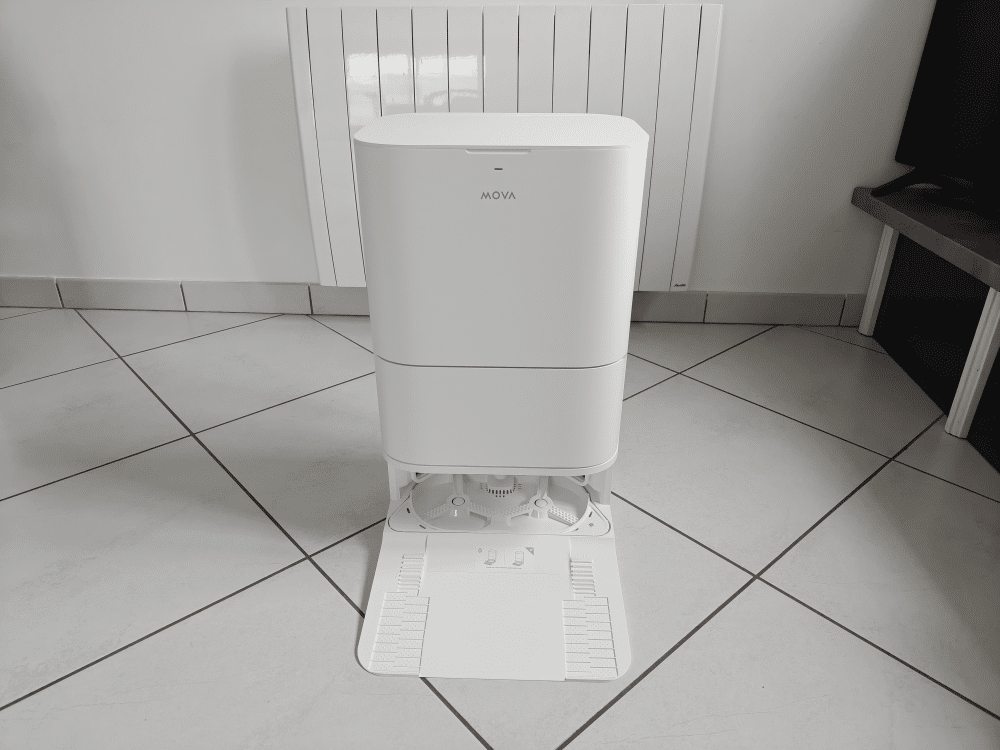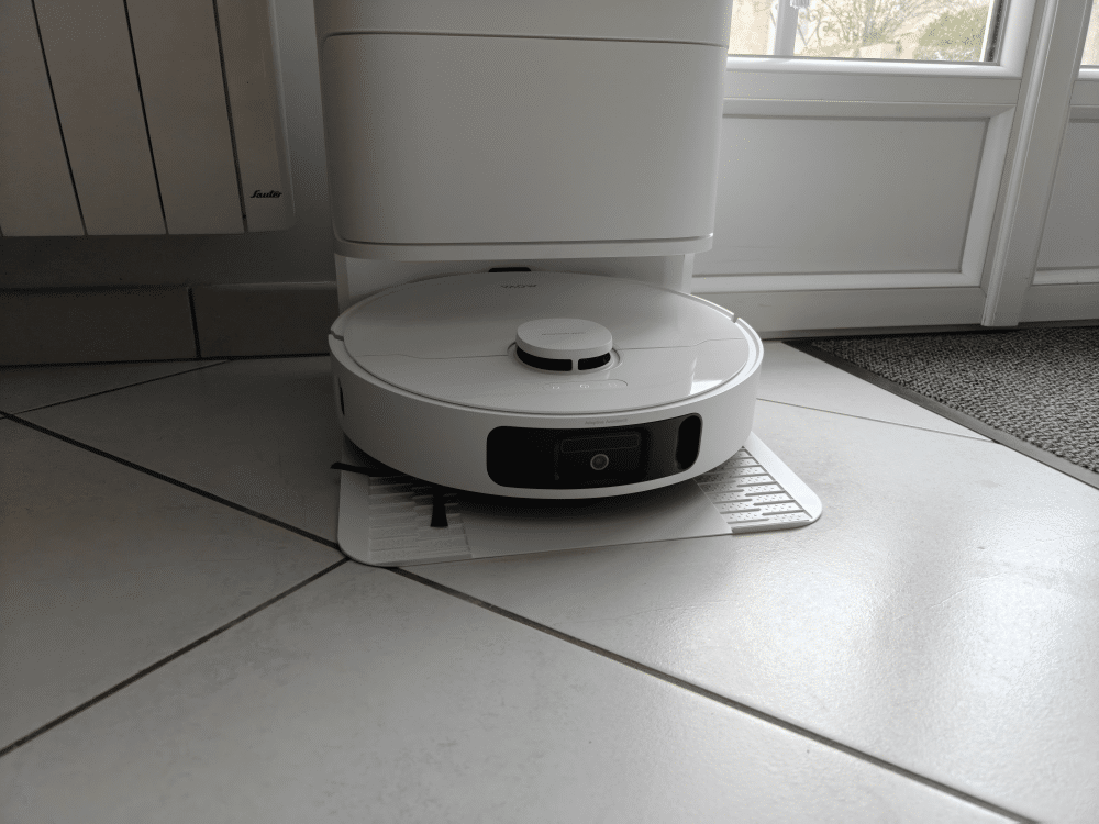 Une fois installée, cette station devient un vrai point fort. Le robot revient après chaque cycle, décharge son bac, rince ses serpillères et se prépare pour la prochaine session.