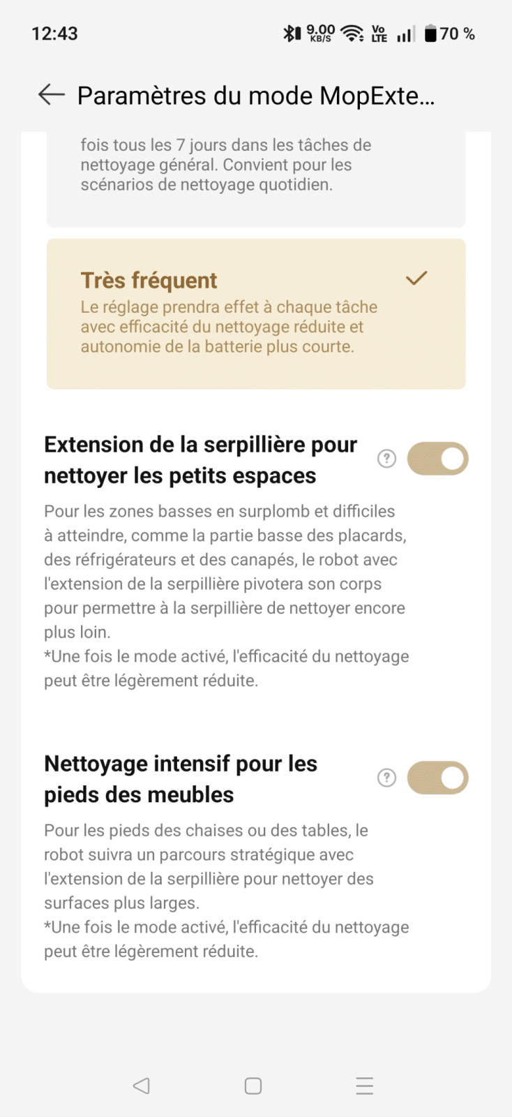 L’application joue un rôle clé dans l’expérience et MOVA a bien travaillé le sujet. L’interface est intuitive, les cartes chargent rapidement et les réglages sont simples à comprendre. On peut ajuster l’aspiration pièce par pièce, choisir le nombre de passages, modifier l’intensité du lavage, ou encore surveiller l’état des consommables. On navigue dans l’application avec la sensation d’avoir un produit mature entre les mains, ce qui n’est pas toujours le cas des marques émergentes.