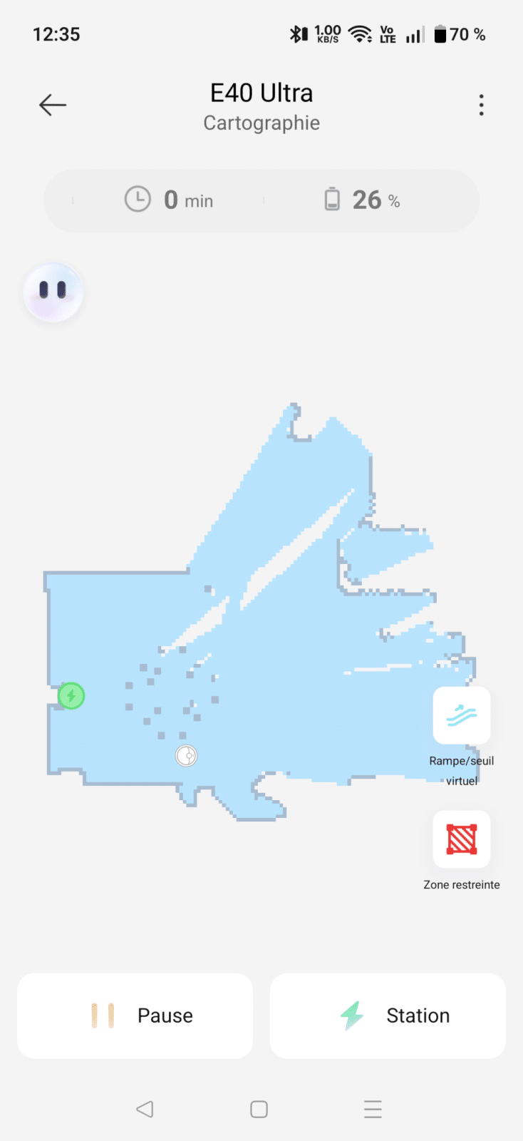 La seule véritable contrainte à l’installation, c’est l’espace nécessaire autour de la station. Elle doit être dégagée, accessible, et suffisamment éloignée des murs pour que le robot puisse manœuvrer. Une fois cette condition remplie, on peut laisser l’E40 Ultra travailler en paix.