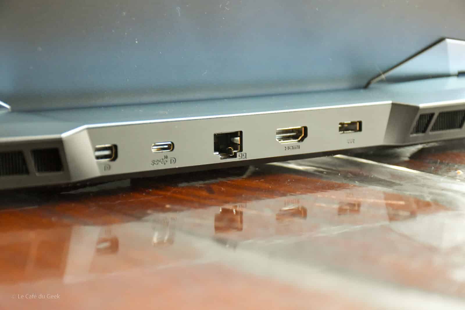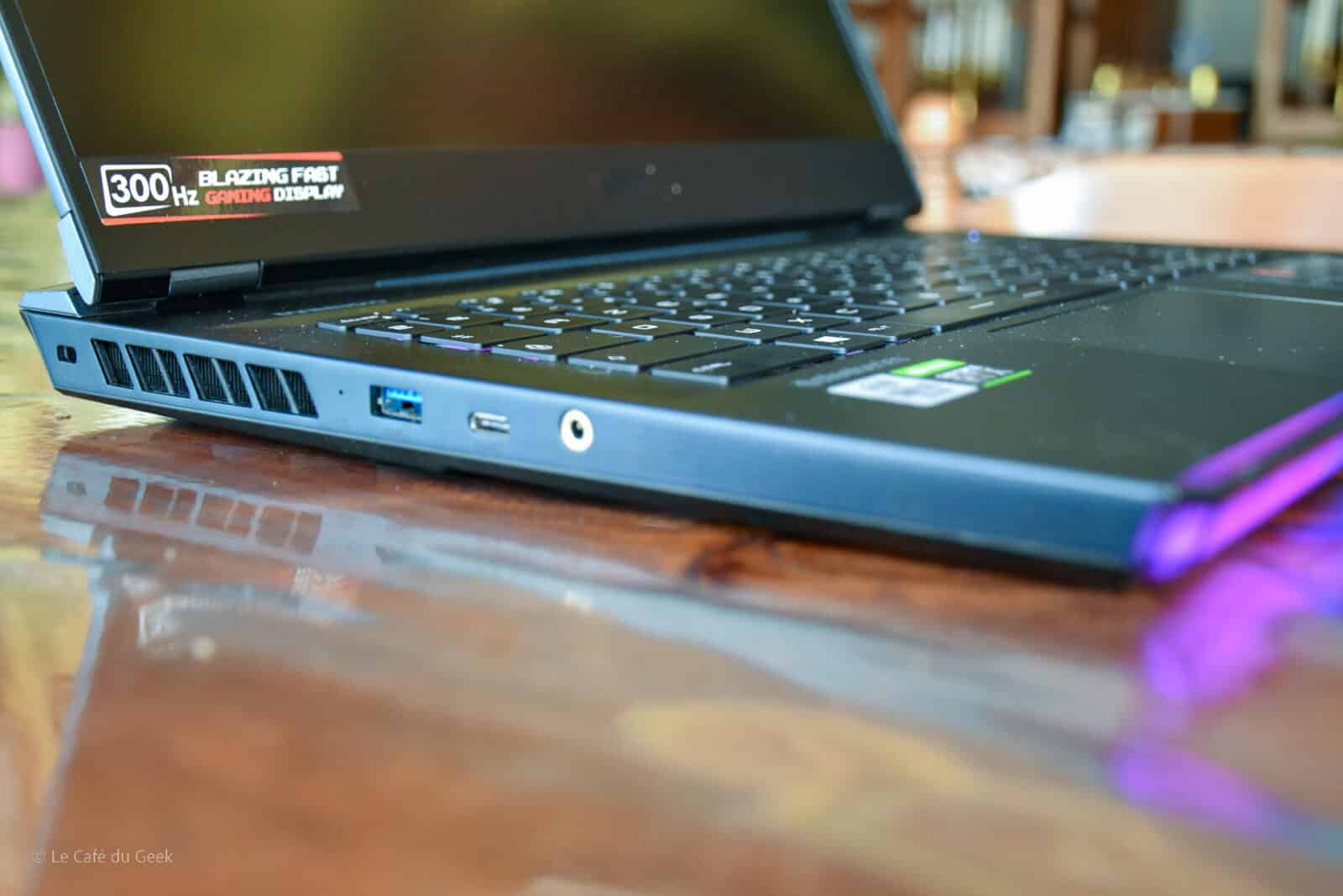 Une telle épaisseur est prévue pour intégrer les meilleurs composants du marché avec du i9 et une 2070 au programme. L’écran de 15,6 pouces s’expose tel un Roi-Soleil devant nos yeux ébahis. Nous l’allumons et là première « déception », une immense barre RGB s’illumine sur la tranche inférieure du MSI GE66 Raider. Bien sûr que nos gouts ne sont pas les vôtres et nous respectons ce choix très assumé de la part de MSI. Le clavier signé Steelseries est également RGB, ce qui amène une continuité à l’éclairage. Le Pad est quant à lui un peu petit pour nous. Vous pourrez retrouver sur la droite, la gauche ainsi que derrière l’ordinateur portable gaming différents ports.