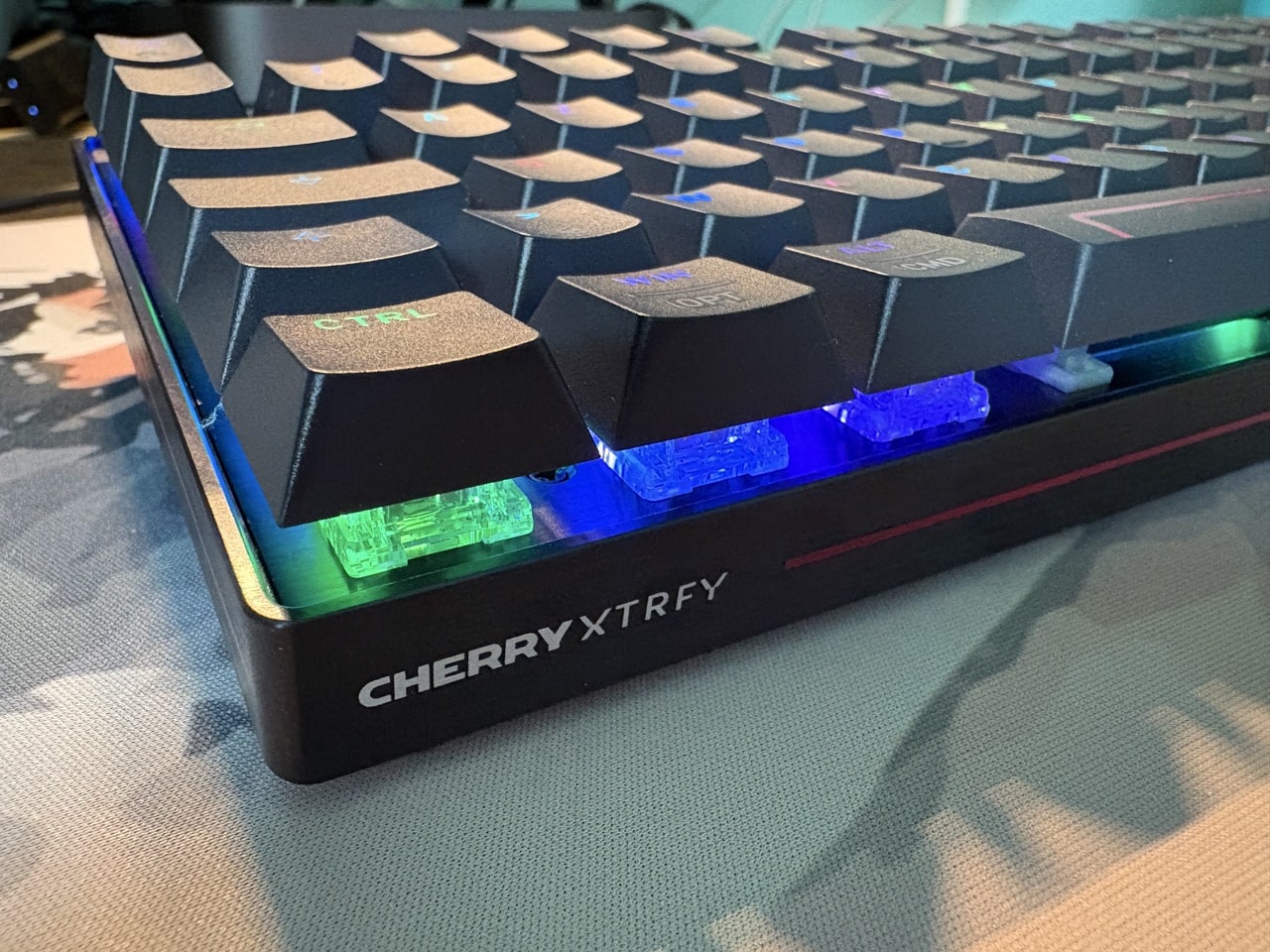 Les keycaps en PBT sont épaisses, bien texturées, et surtout très agréables sous les doigts. Elles ne brillent pas après quelques heures d’utilisation, la frappe est nette, et le bruit reste contenu sans être étouffé. On sent que CHERRY XTRFY a soigné chaque détail.