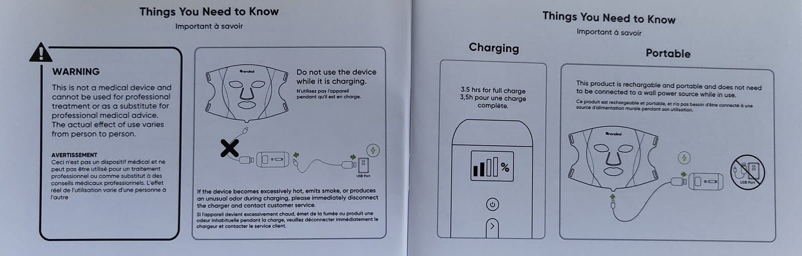L’alimentation sur batterie est un autre atout. Le masque peut ainsi fonctionner sur batterie pour plusieurs séances à domicile. Bien évidemment il se recharge sur secteur avec son câble livré avec.