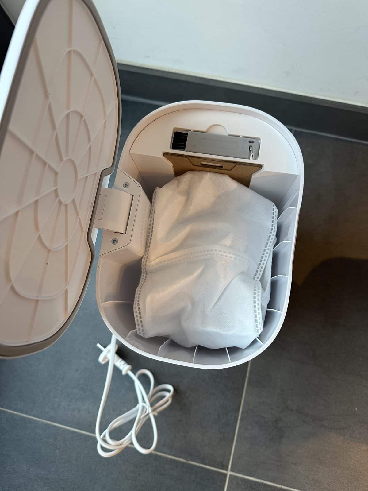 La station de vidange automatique aspire la poussière dans un sac de 3,5 L, ce qui permet plusieurs semaines d’autonomie sans intervention.