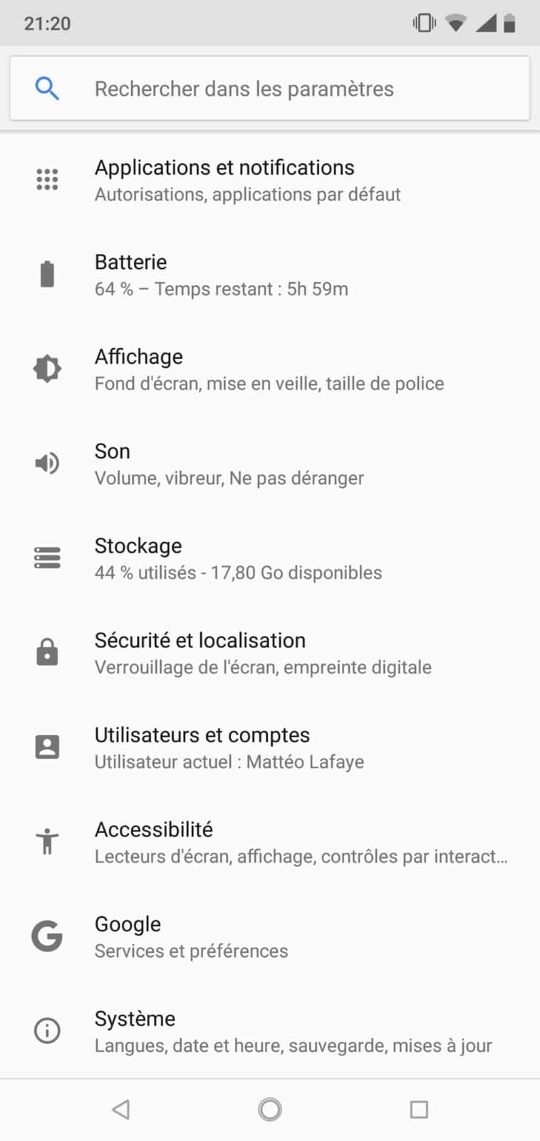 Le smartphone est équipé de la version 8.1 d’Android en interface stock. Le smartphone est donc certifié Android One de Google censé apporté des mises à jour plus rapides sans intermédiaire entre le constructeur et Google. Une mise à jour Android 9 devrait arriver dans les prochains mois même si la version 8 est déjà très récente. On retrouve donc une interface très simple, sans surcouche, avec la présence de la majorité des applications Google intégrées à Android de base. L’absence de surcouche est un bon point, car cela permet souvent une meilleure fluidité du smartphone.