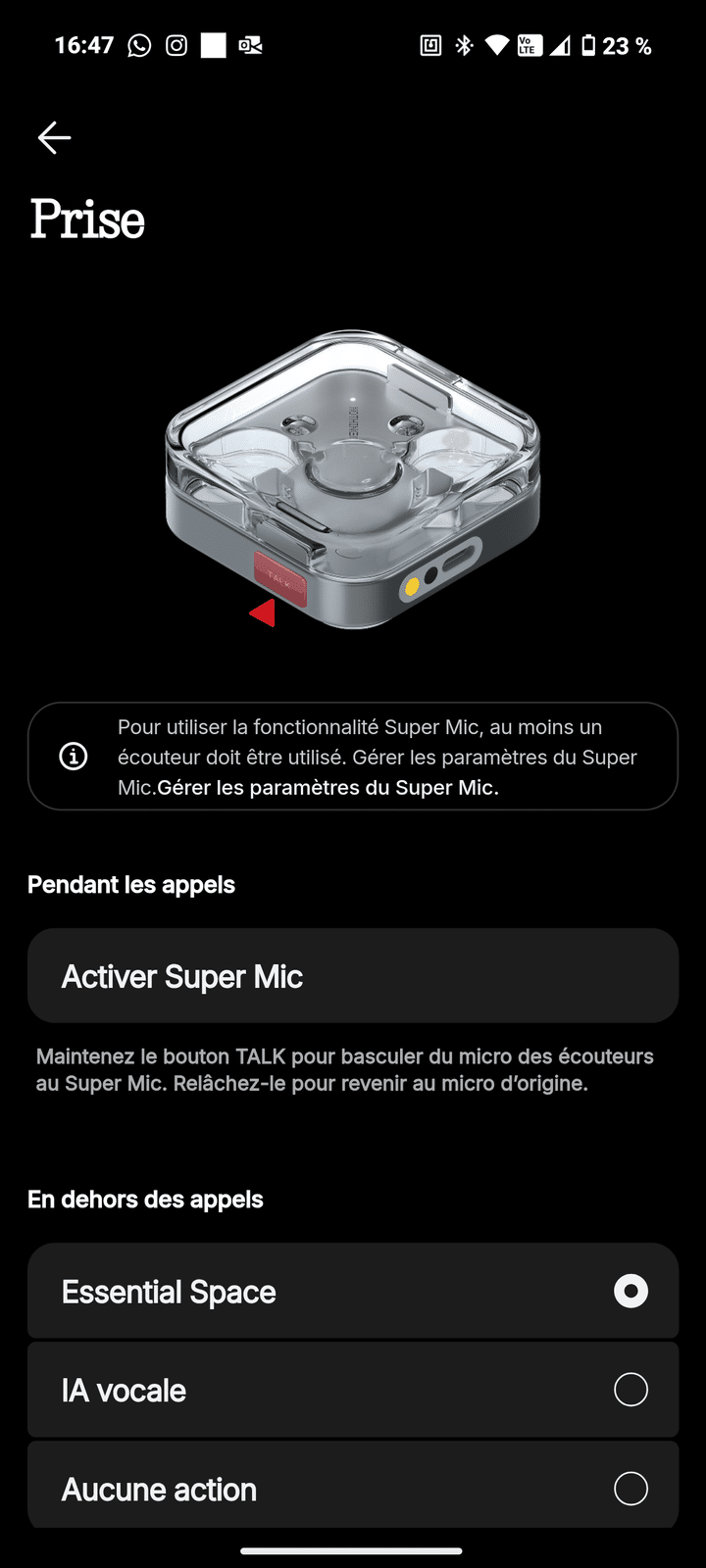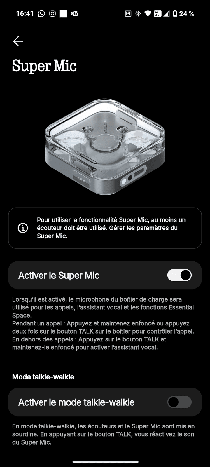 Également, le Super Mic, nouveau venu, s’avère très utile. Aussi, en un geste, les micros du boitier s’activent pour isoler votre voix et réduire les bruits environnants. Les appels deviennent encore plus clairs même dans la rue ou un café animé. Quant au mode Talk, il permet par exemple d’enregistrer un mémo vocal. Ce dernier va alors dans l’essential space, l’IA de Nothing. Essential Space transcrit ce dernier automatiquement. Finalement,, plus pratique, plus efficace au quotidien et quand on associe le tout à l’écosysteme complet cela devient très performant. En somme, les associer à un Nothing phone devient très intéressant.