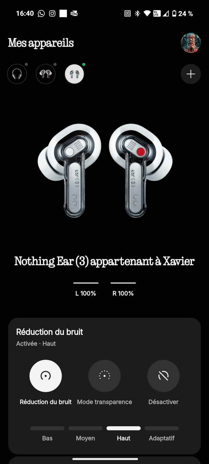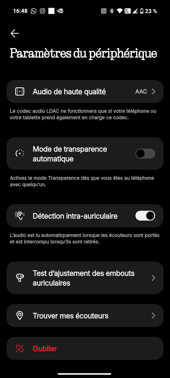 La connexion est instantanée via Fast Pair et la stabilité Bluetooth est exemplaire. Par ailleurs, l’app Nothing X permet de tout contrôler : égaliseur, réduction de bruit, tests auditifs, ou encore le mode transparence.