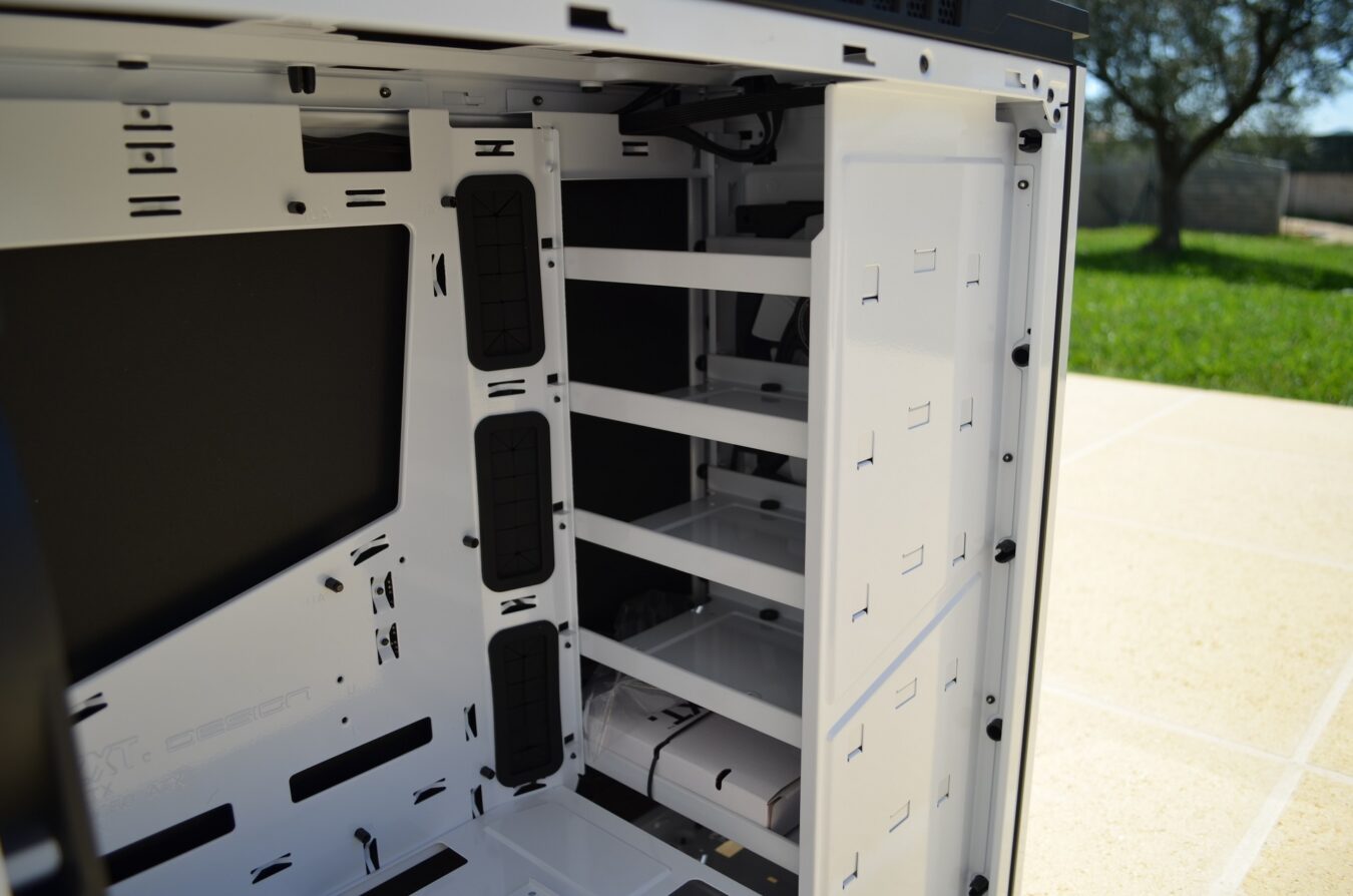 Derrière ces fameux ventilateurs se cachent 5 emplacements pour HDD/SSD, avec beaucoup de place, ils auront de quoi être ventilés correctement. Deux emplacements pour SSD sont proposés sur le dessus du cache d’alimentation. C’est un manque de gout mais un grand plus pour ceux qui ont besoin de stockage !
