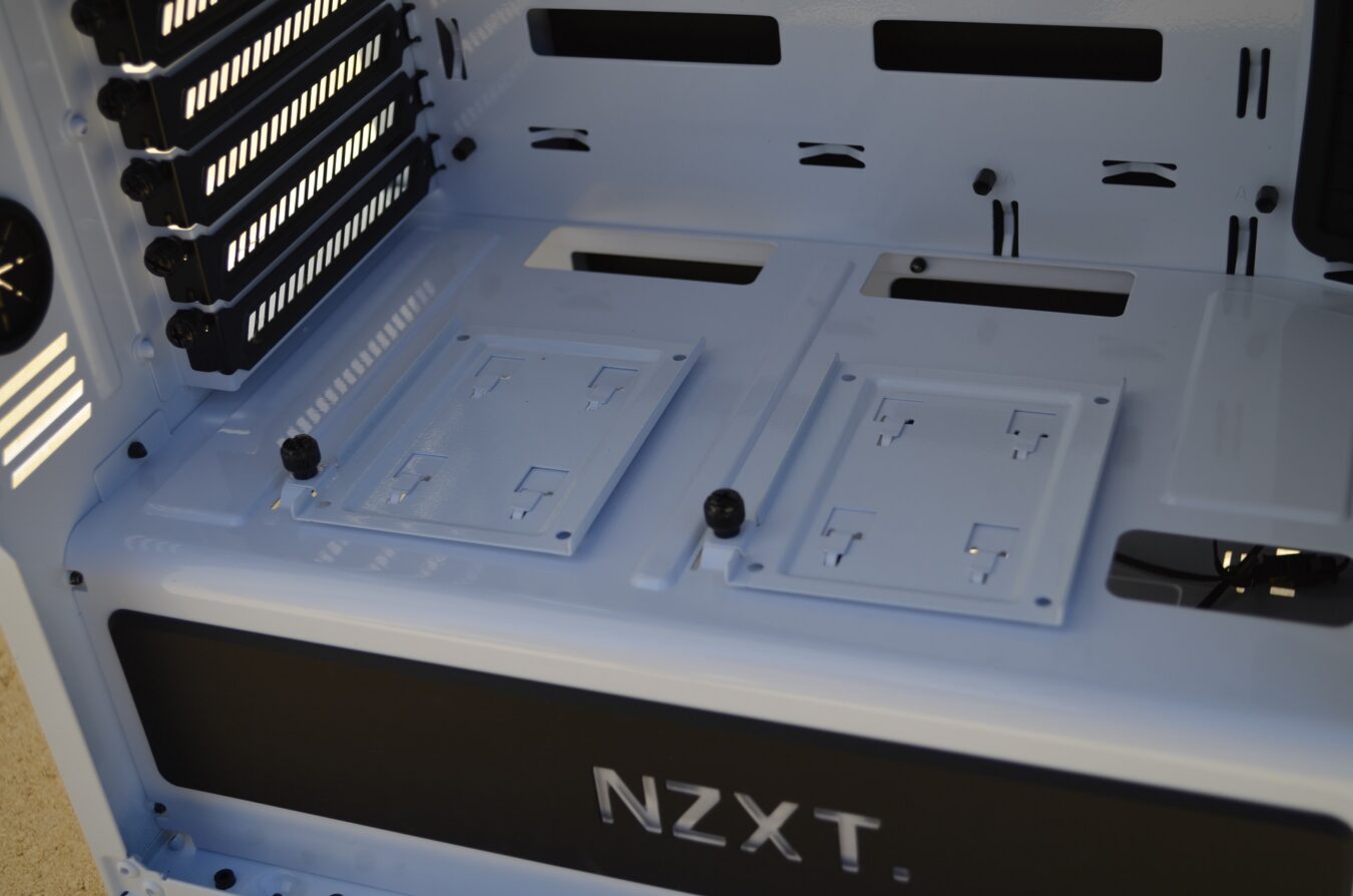 L’arrière est comme sur chaque boitier, on y retrouve un cache 140 mm pour l’aération du ventirad/watercooling, l’emplacement pour la plaque de la carte-mère, sept slots d’extension, deux passe-cloisons et l’emplacement pour l’alimentation. Chose qui nous a mis du temps à découvrir, un interrupteur pour allumer les LEDs à l’arrière du boitier et sur le logo NZXT est présent sur la gauche.