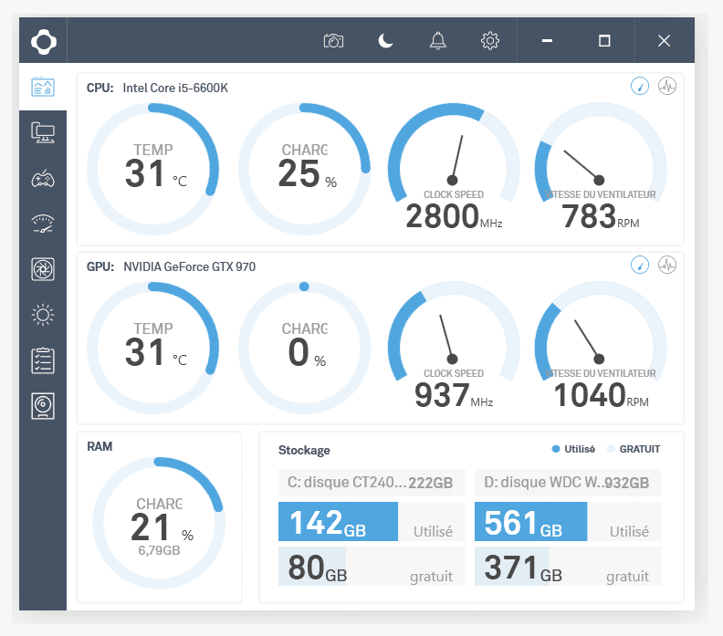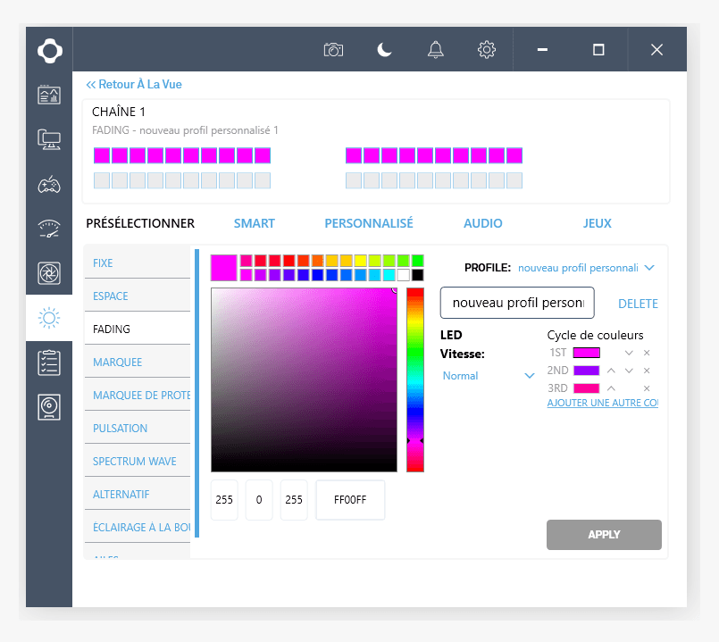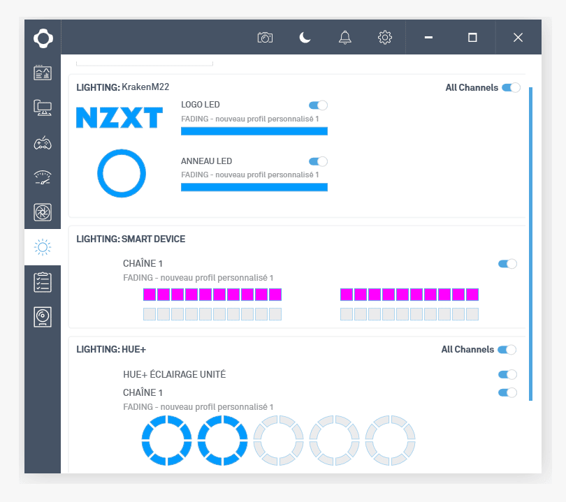 Les couleurs de ces parties qui s’éclairent sont personnalisables dans le logiciel CAM qui sert au paramétrage de tous les appareils connectés de NZXT. On y retrouve des informations sur la température et la vitesse de rotation des ventilateurs ainsi que différents modes d’éclairage avec divers effets et couleurs paramétrables. Le logiciel CAM est très simple à prendre en main. On apprécie grandement ce niveau de personnalisation.