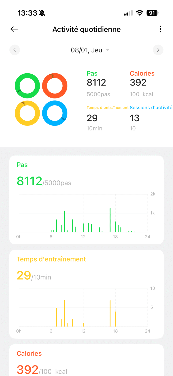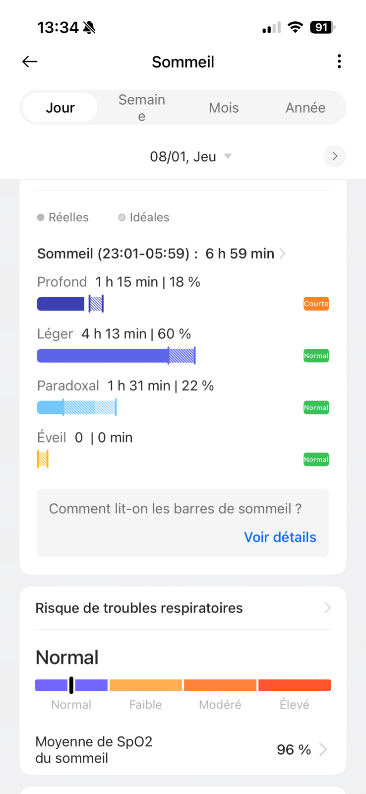 Le suivi du sommeil m’a agréablement surpris. La montre détecte automatiquement les phases de sommeil, les périodes d’éveil, et fournit un rapport clair dans l’application. Ce n’est pas un outil médical, évidemment, mais c’est suffisant pour repérer des tendances et mieux comprendre ses habitudes de repos. Et comme la montre est très légère, je n’ai aucun problème à la garder la nuit.