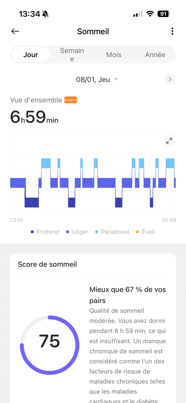 Le suivi du sommeil m’a agréablement surpris. La montre détecte automatiquement les phases de sommeil, les périodes d’éveil, et fournit un rapport clair dans l’application. Ce n’est pas un outil médical, évidemment, mais c’est suffisant pour repérer des tendances et mieux comprendre ses habitudes de repos. Et comme la montre est très légère, je n’ai aucun problème à la garder la nuit.