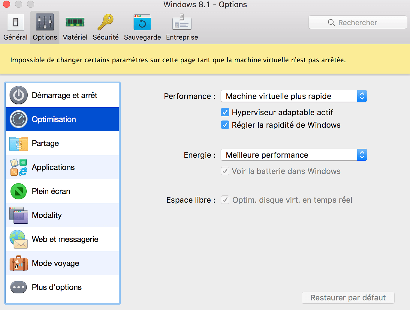 Parallels Desktop 11 propose de nombreux réglages concernant les performances dédiées à la machine virtuelle et on peut les modifier pour augmenter la puissance de celle-ci. Il est également possible d’optimiser les performances ou la batterie, au choix. Enfin, un mode voyage permet de maintenir une longue durée de vie de la batterie pour pouvoir utiliser Windows. Vous l’aurez compris, je parle uniquement de Windows mais tous les systèmes d’exploitation peuvent être installés, on peut même faire une machine virtuelle de OS X.