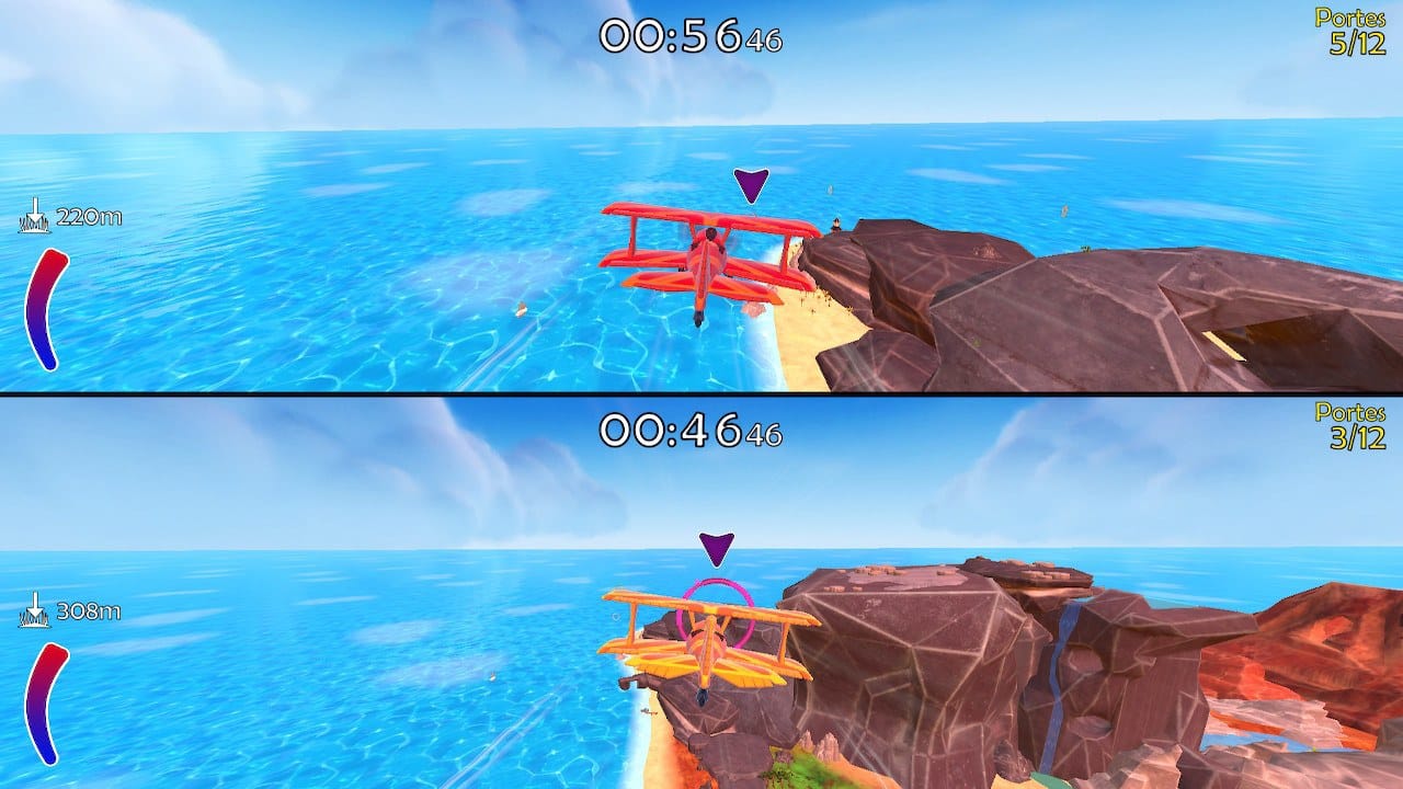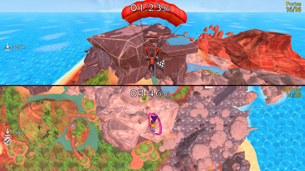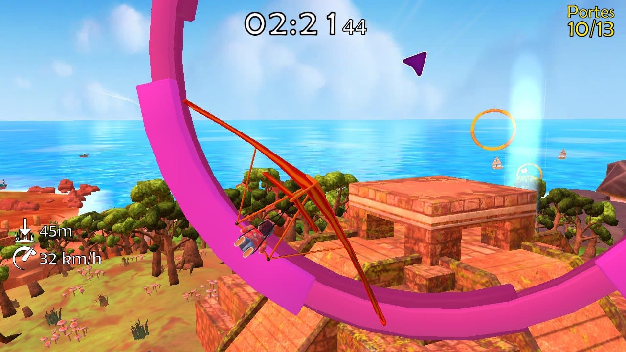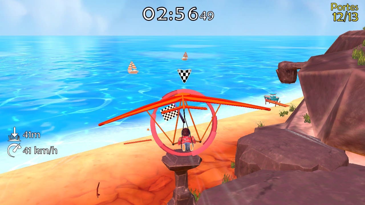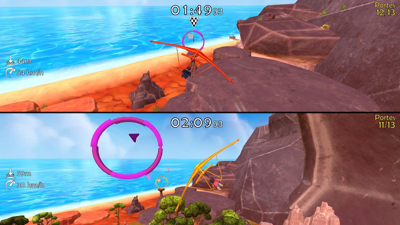 Enfin, les épreuves de deltaplanes sont mes préférées pour ma part. Car ces dernières sont carrément planantes, c’est le cas de le dire. Ainsi, on se retrouve planant littéralement dans un ciel azur et l’on se laisse porter par le vent. Mais l’on descend petit à petit, il est donc nécessaire de prendre des colonnes d’air ventilé pour remonter dans les cieux. Après avoir repris un peu d’altitude, il ne faut pas oublier de passer dans les portes symbolisées par des anneaux circulaires.