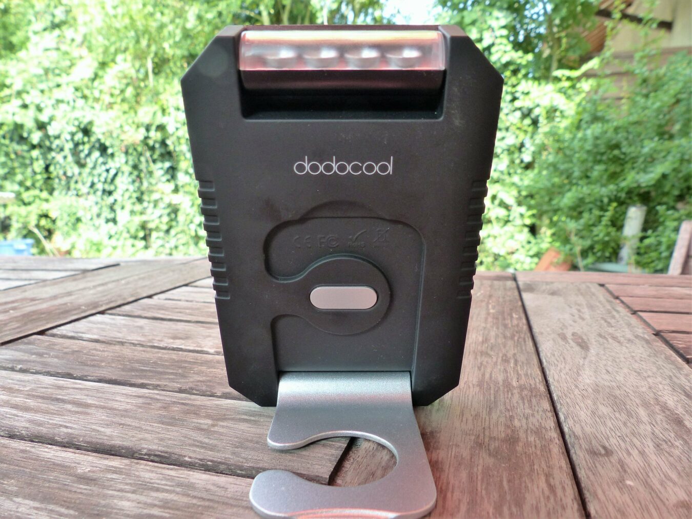 Le premier produit est une batterie de secours avec une sortie USB. En outre on peut y brancher n’importe quel appareil qui aurait besoin d’énergie. De plus, le powerbank Dodocool propose une lampe torche avec 4 Leds très puissantes. Et il dispose également d’un port micro USB pour la recharger sur un chargeur secteur ou sur un PC. Mais sa principale fonction réside dans sa surface de panneaux solaires pour convertir les rayons du soleil en électricité. Sur l’arrière, ou se trouve le bouton unique, il y a aussi un support métallique pivotant qui peut faire office de crochet ou trépied.