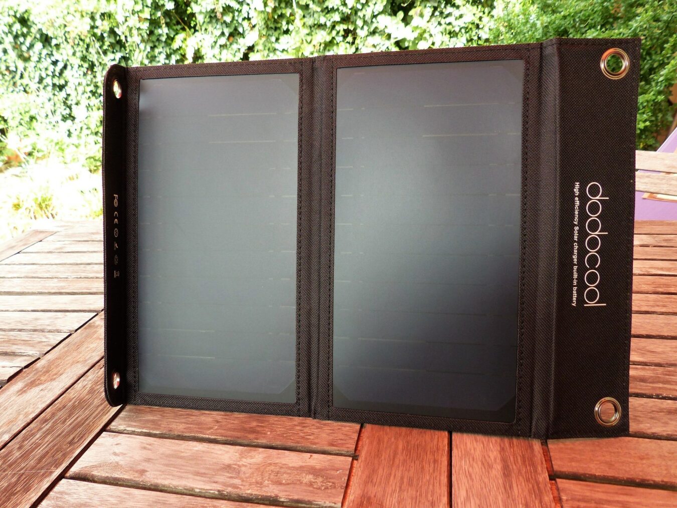 Dodocool m’a aussi fait découvrir une autre solution solaire. Un double panneau solaire nomade pliable capable de délivrer 5 volts. Aussi le dispositif possède une capacité de 10 000 mAh qui peut recharger 2 appareils via 2 ports USB. Et il est pourvu d’anneaux four le fixer par exemple sur un sac à dos et il y a également un rabat qui fait office de pied, ajustable avec un cordon.