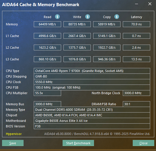 Avec une latence CL28, on est dans le haut du panier en termes de performances sur le papier. La fréquence maximale de 6000 MHz est bien atteinte, via l’activation du profil EXPO (ou XMP) et un benchmark sous Aida64 nous donne des résultats plus que convenables. Les latences sont excellentes, malgré une latence sur le cache L3 un poil élevé par rapport à la moyenne.
