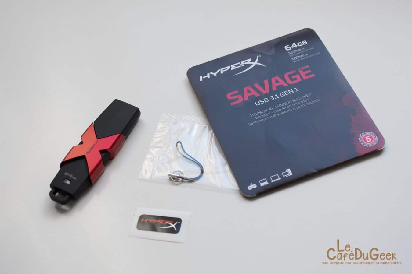 On retrouve dans le bundle, en plus de la clé USB 3.1 Savage dans sa version 64 Go, une attache porte-clé et un petit autocollant de la marque. On notera que la notice indique une jolie garantie de 5 ans pour la clé Savage.