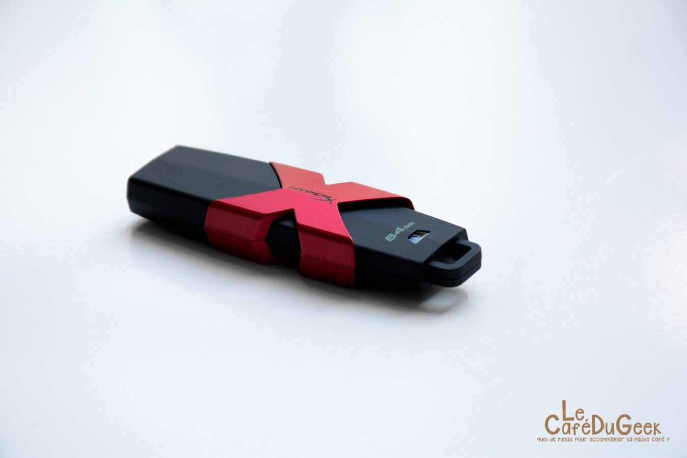 Le corps de la clé d’un noir mat, doux au toucher. Alors qu’on retrouve au milieu, le logo HyperX en rouge métallisé.