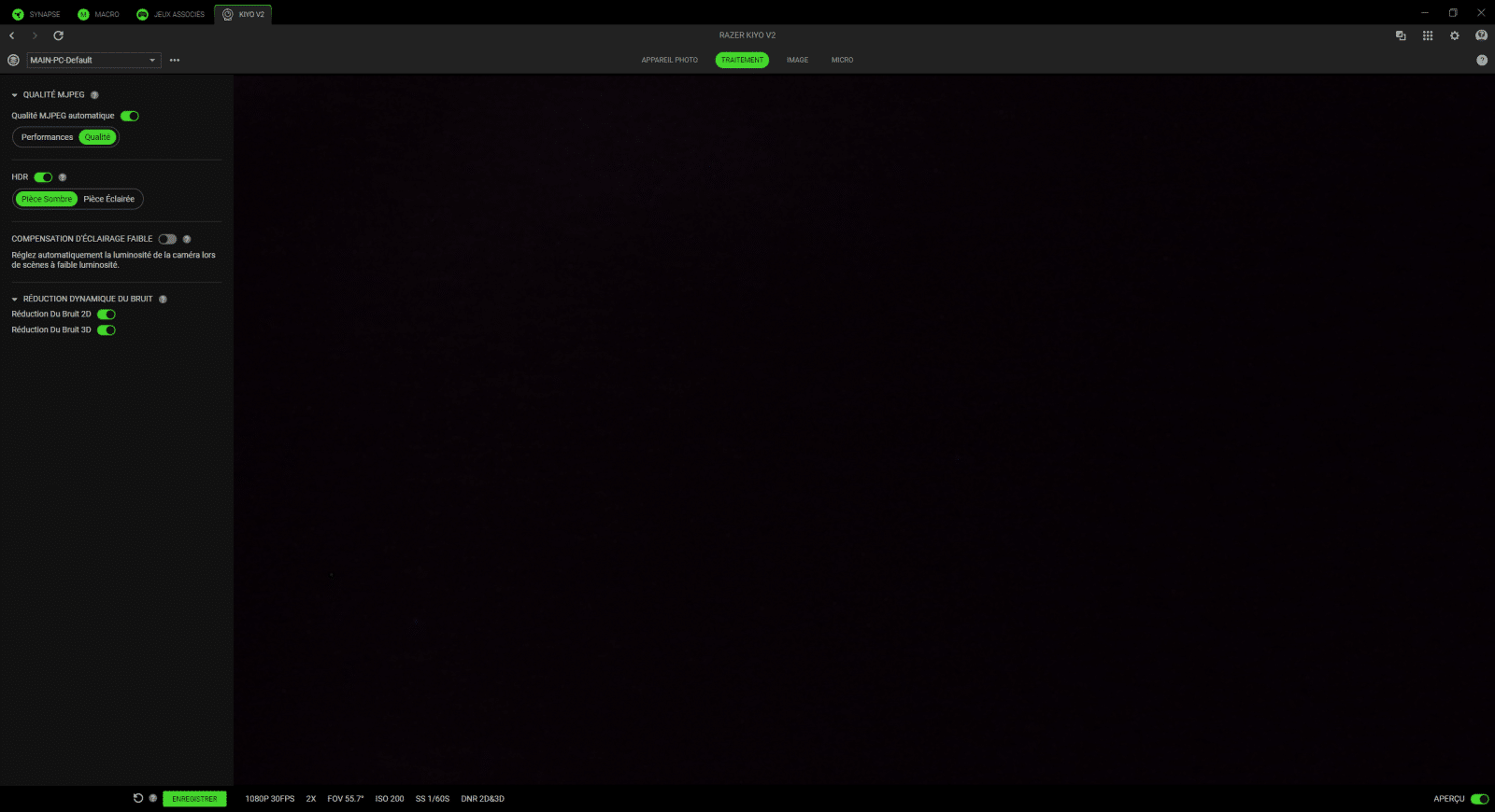 La Razer Kiyo V2 s’appuie fortement sur son logiciel pour se différencier, et cela se ressent dès les premières minutes d’utilisation. Razer Synapse devient ici le véritable centre de contrôle de la webcam. L’interface est claire, relativement sobre, et surtout accessible, même pour ceux qui n’ont pas l’habitude de manipuler des réglages vidéo avancés. Tous les paramètres essentiels sont regroupés au même endroit, sans multiplier les menus inutiles. On peut ainsi ajuster rapidement la luminosité, le contraste, la balance des blancs ou encore l’exposition, avec un rendu immédiat à l’écran. L’objectif est clair : obtenir une image flatteuse sans passer des heures à peaufiner chaque détail.